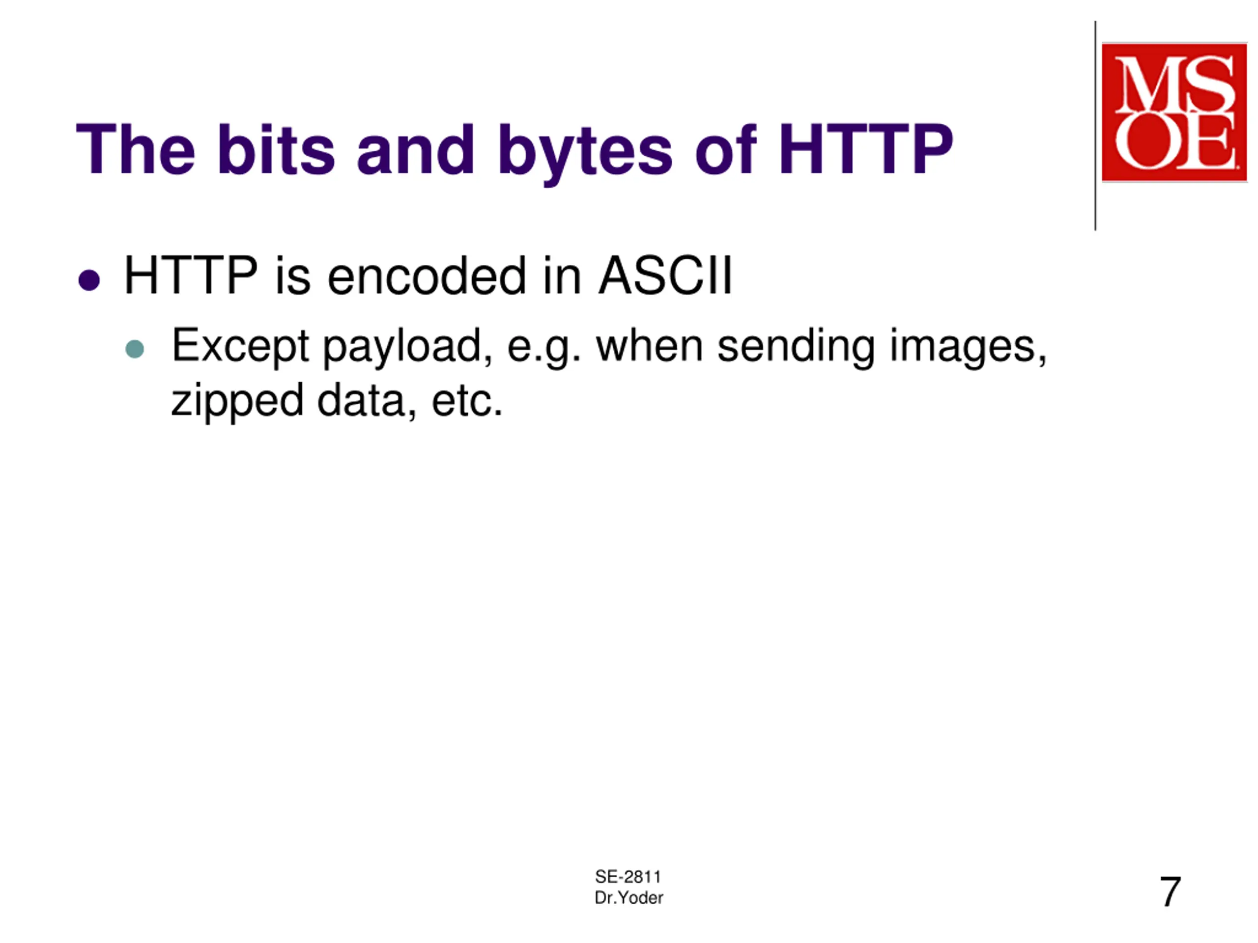 The bits and bytes of HTTP HTTP is encoded in ASCII Except payload, e.g. when sending images, zipped data, etc. SE-2811 Dr.Yoder 7