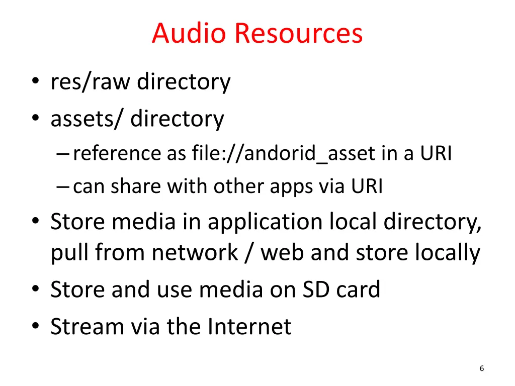 Android Audio Using the Android MediaPlayer class Common Audio Formats supported: MP3, MIDI (.mid and others), Vorbis (.ogg), WAVE (.wav) and others Sources of audio local resources (part of app) internal URIs (Content Provider for other audio available) External URLs (streaming) 5