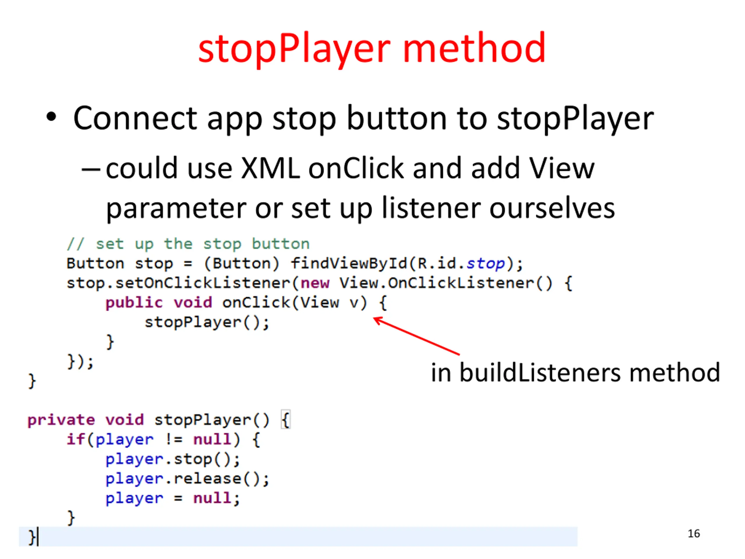 stopPlayer method Connect app stop button to stopPlayer could use XML onClick and add View parameter or set up listener ourselves in buildListeners method 16