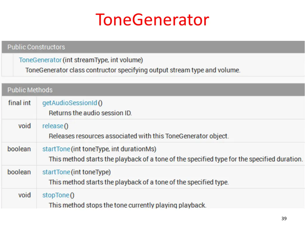 Other Sources of Sound AudioTrack http://developer.android.com/reference/android/media/AudioTrack.html low level API for handling audio streams in formats MediaPlayer cannot handle ToneGenerator http://developer.android.com/reference/android/media/ToneGenerator.html Traditional phone tones Dual-Tone Multi-Frequency (DTMF) Just to make sounds, not send tones over phone network 38
