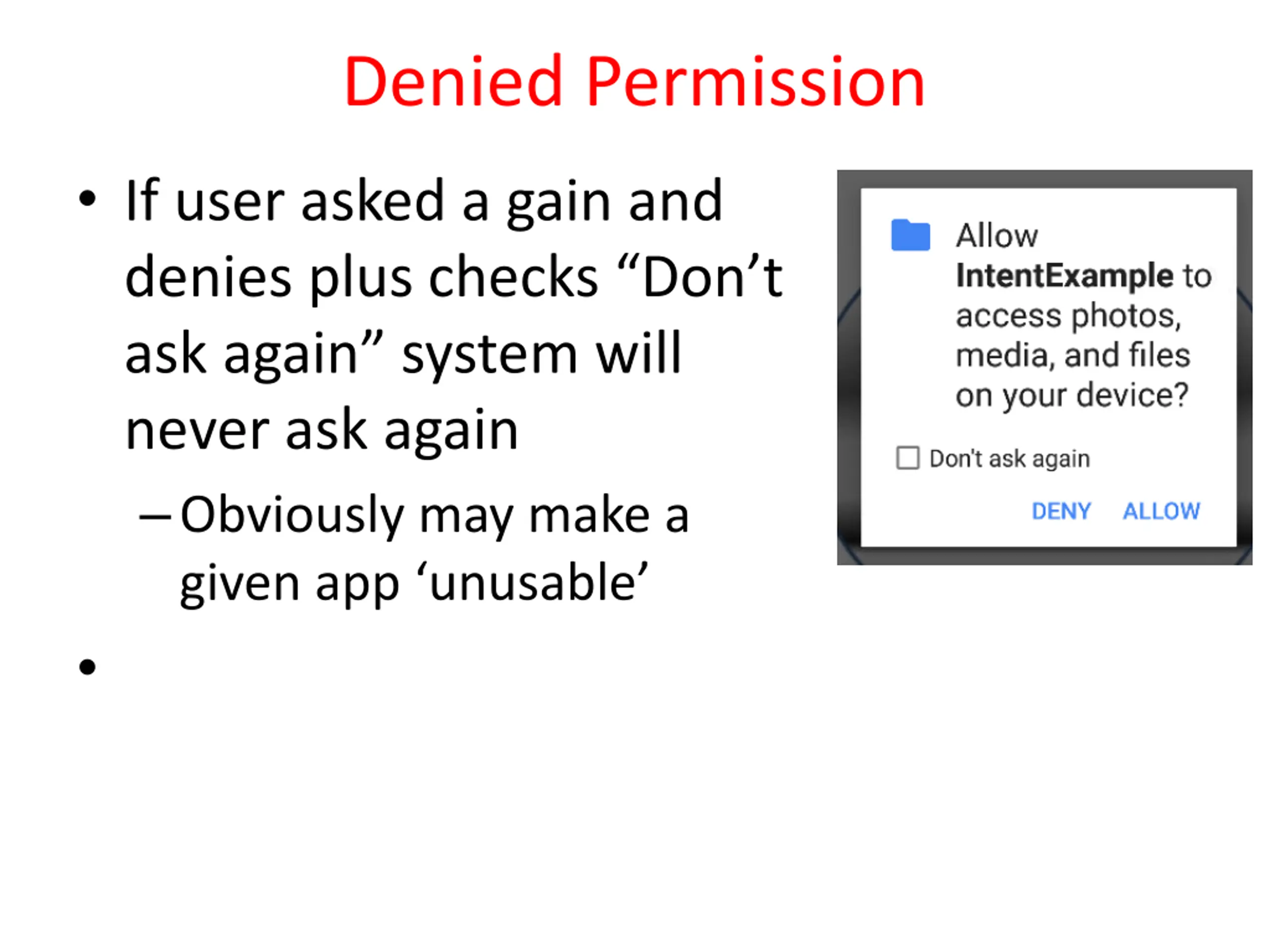 Denied Permission If user asked a gain and denies plus checks Don t ask again system will never ask again Obviously may make a given app unusable