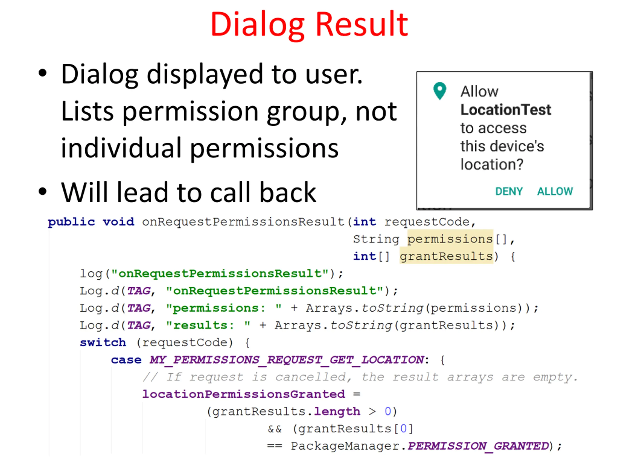 Dialog Result Dialog displayed to user. Lists permission group, not individual permissions Will lead to call back