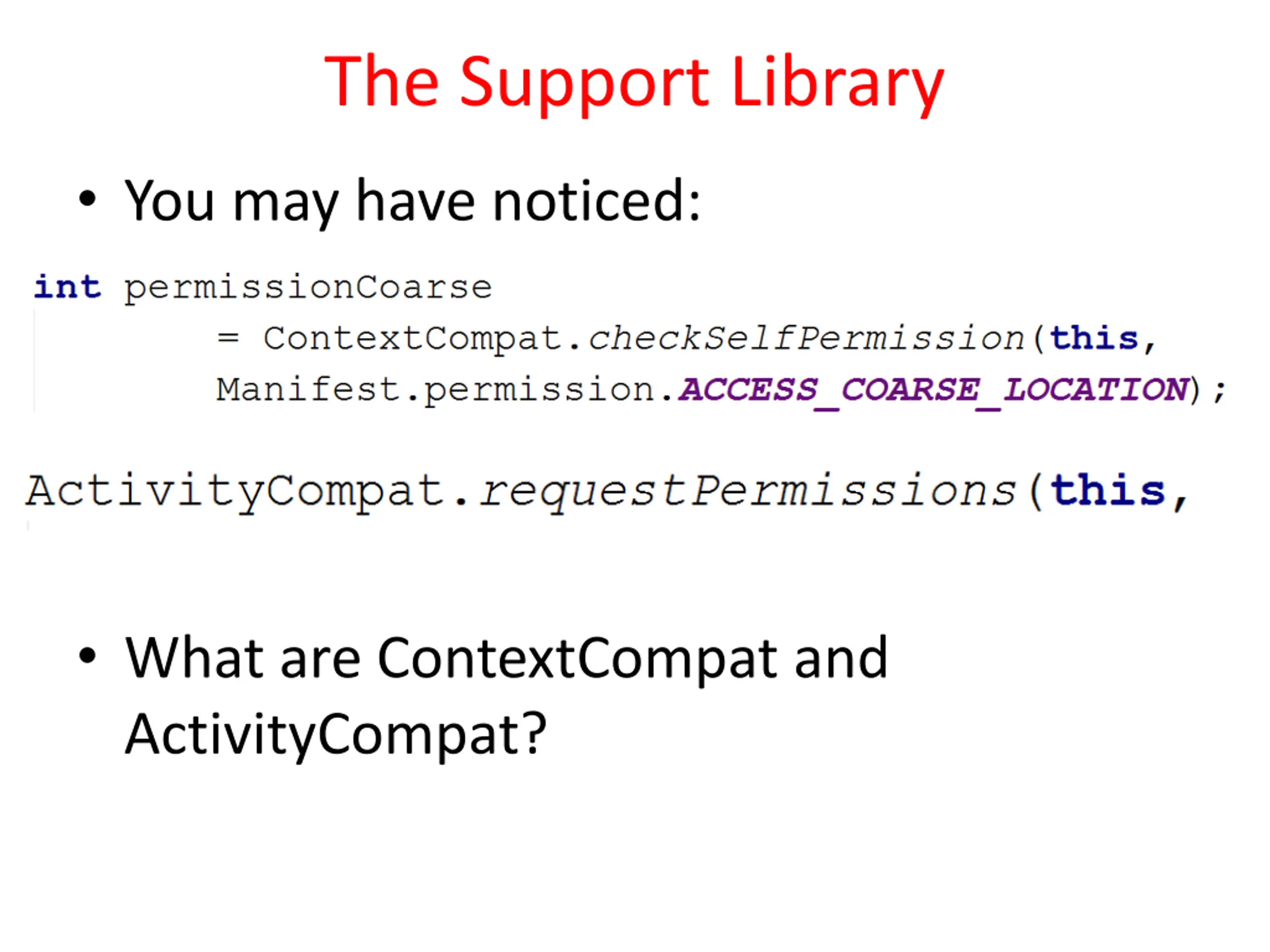The Support Library You may have noticed: What are ContextCompat and ActivityCompat?