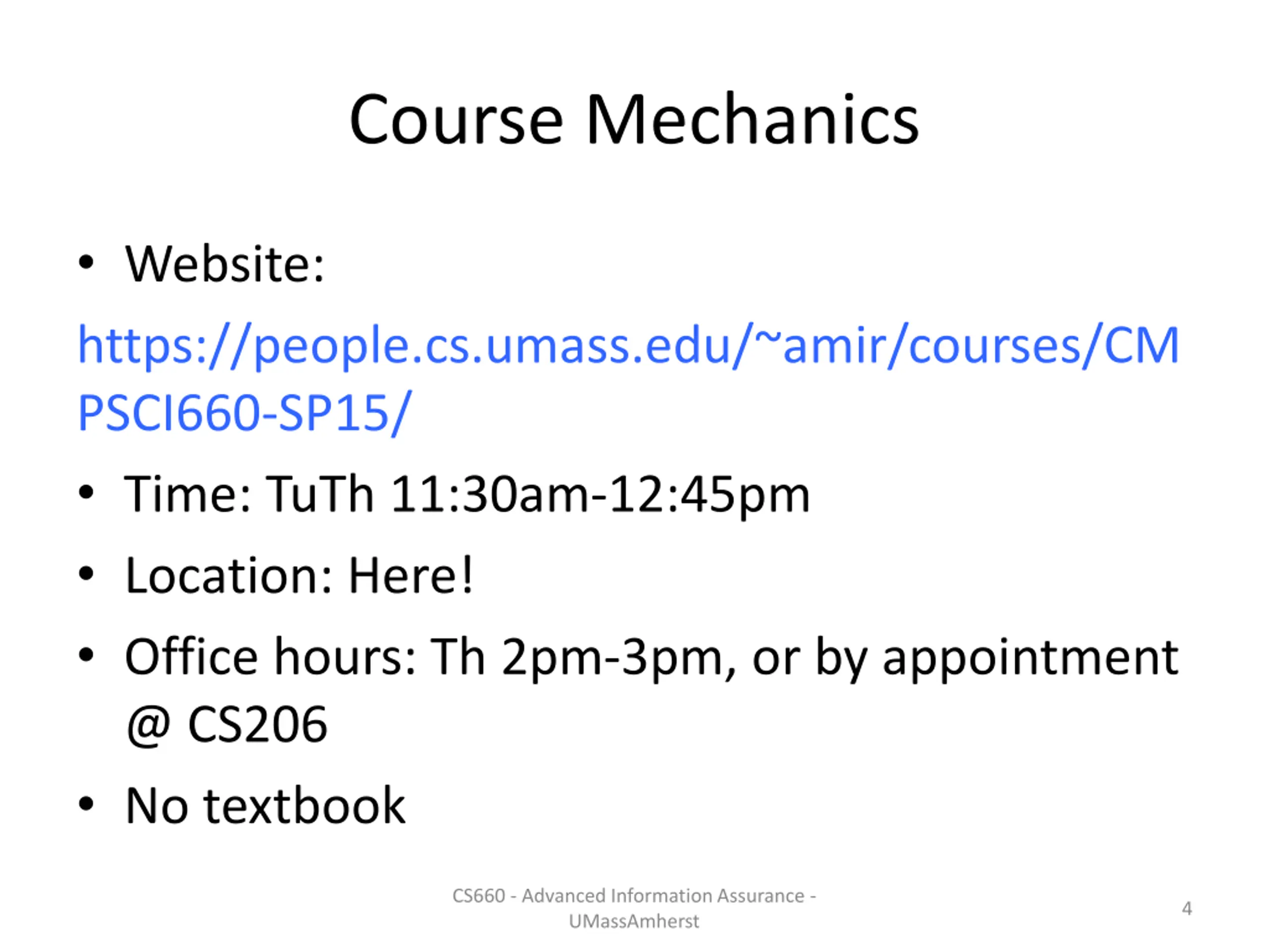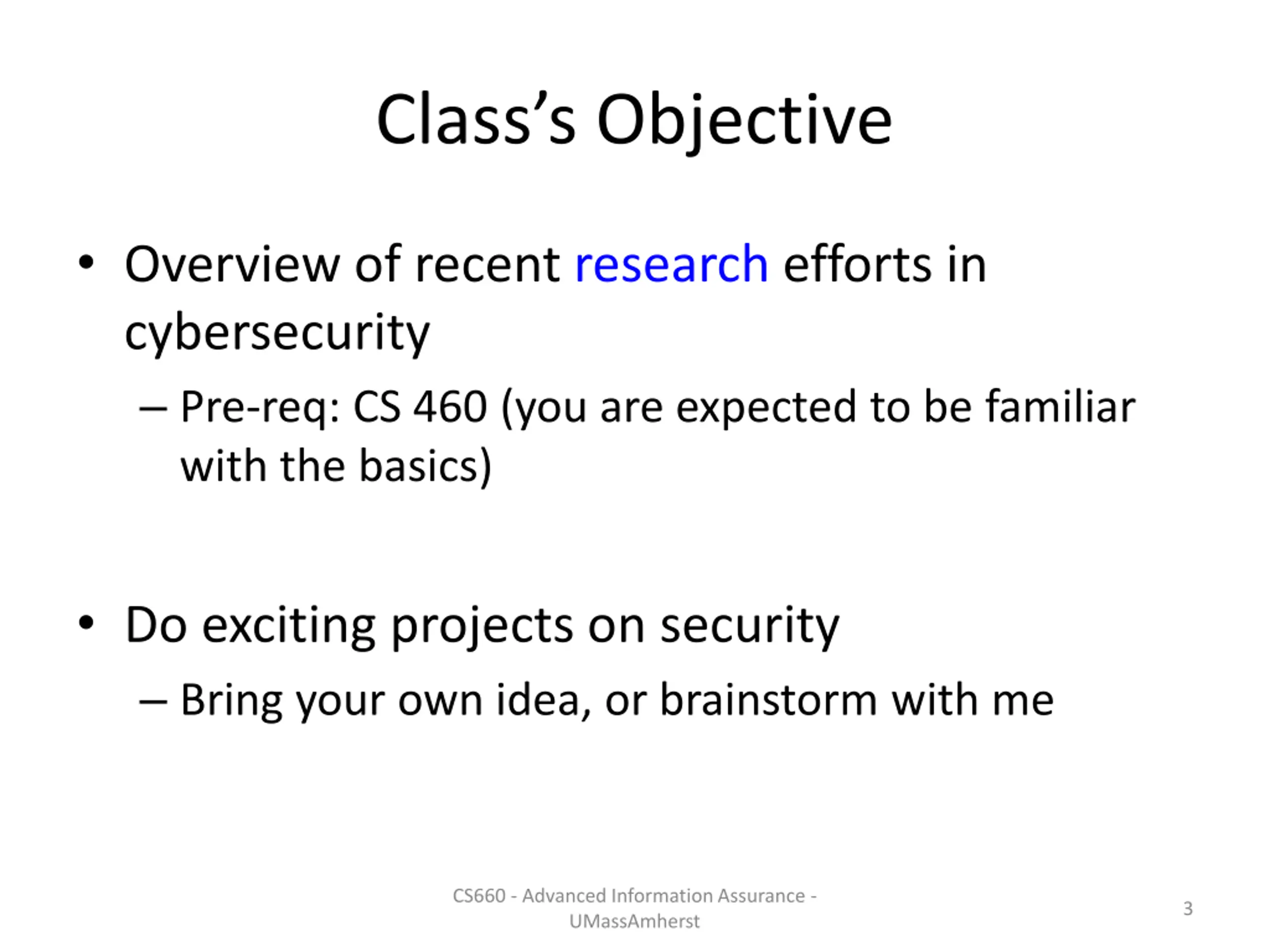 Classs Objective Overview of recent research efforts in cybersecurity Pre-req: CS 460 (you are expected to be familiar with the basics) Do exciting projects on security Bring your own idea, or brainstorm with me CS660 - Advanced Information Assurance - UMassAmherst 3
