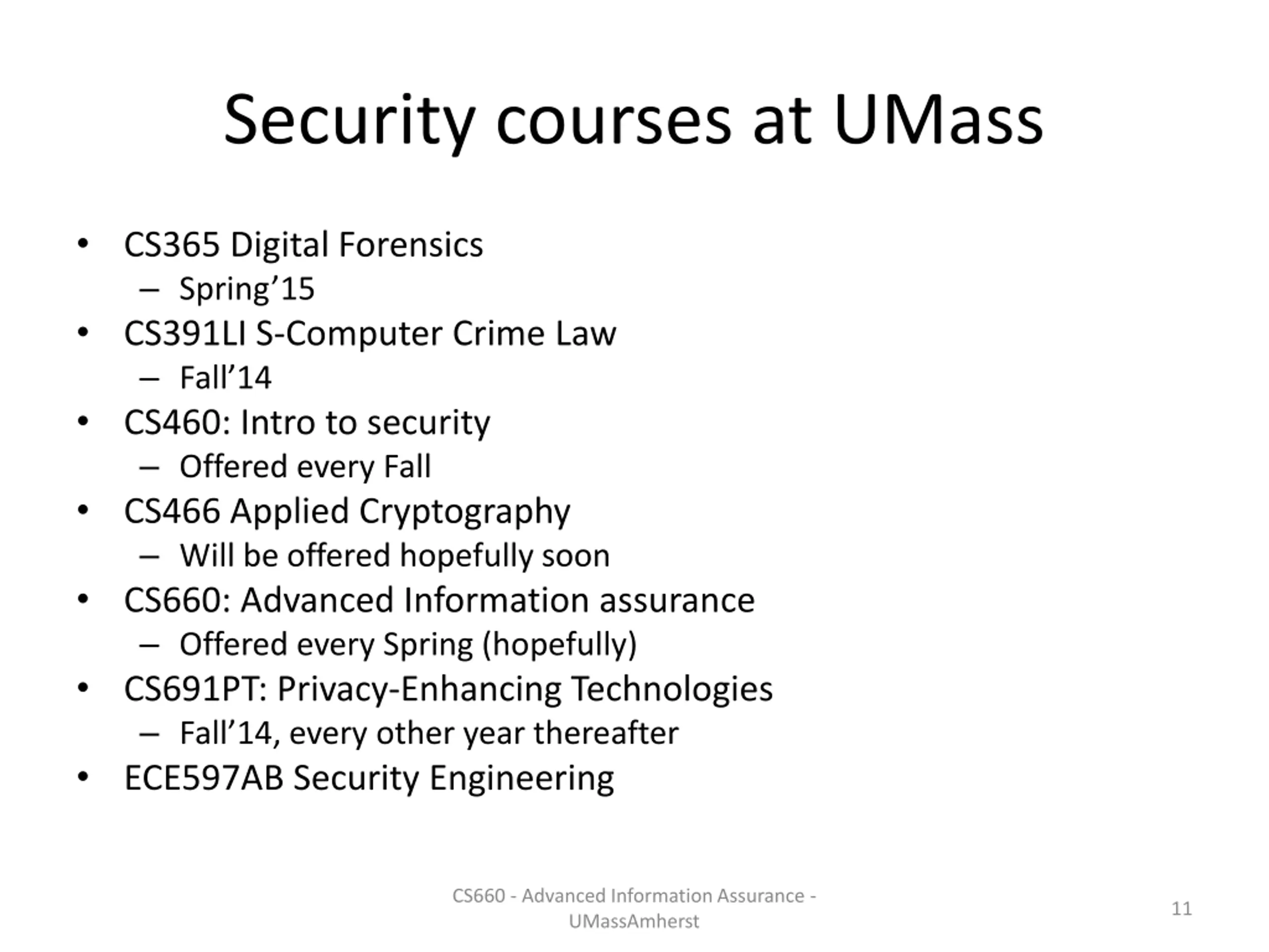 Exams One midterm exam: Covers selected papers presented before the exam date Final exam: Covers selected papers from the second half of the semester You should need minimal preparation if you have read the papers during the semester Exam dates on the website CS660 - Advanced Information Assurance - UMassAmherst 10