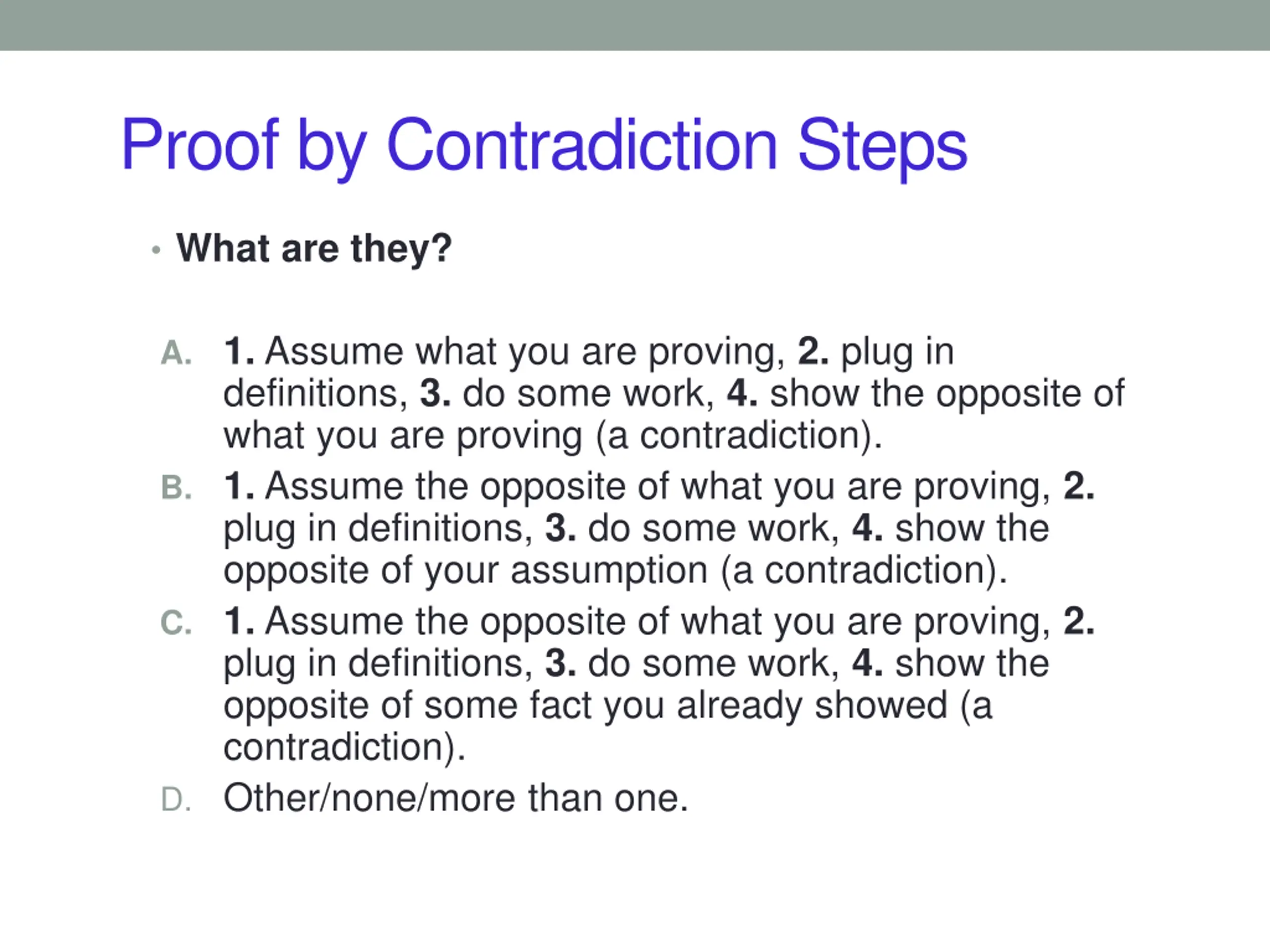 Proof by Contradiction Steps What are they? A. 1. Assume what you are proving, 2. plug in definitions, 3. do some work, 4. show the opposite of what you are proving (a contradiction). B. 1. Assume the opposite of what you are proving, 2. plug in definitions, 3. do some work, 4. show the opposite of your assumption (a contradiction). C. 1. Assume the opposite of what you are proving, 2. plug in definitions, 3. do some work, 4. show the opposite of some fact you already showed (a contradiction). D. Other/none/more than one.