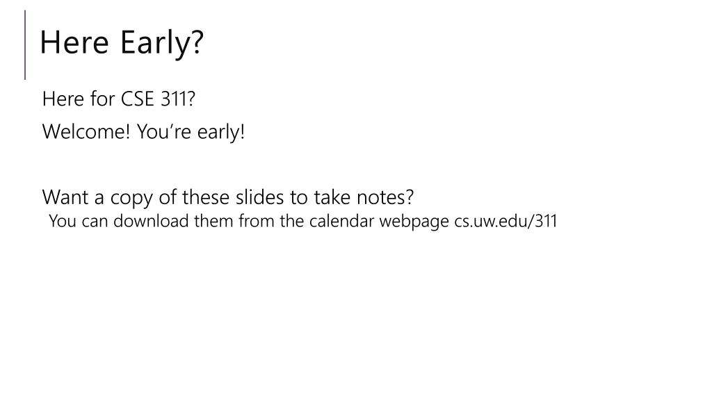 Here Early? Here for CSE 311? Welcome! You re early! Want a copy of these slides to take notes? You can download them from the calendar webpage cs.uw.edu/311