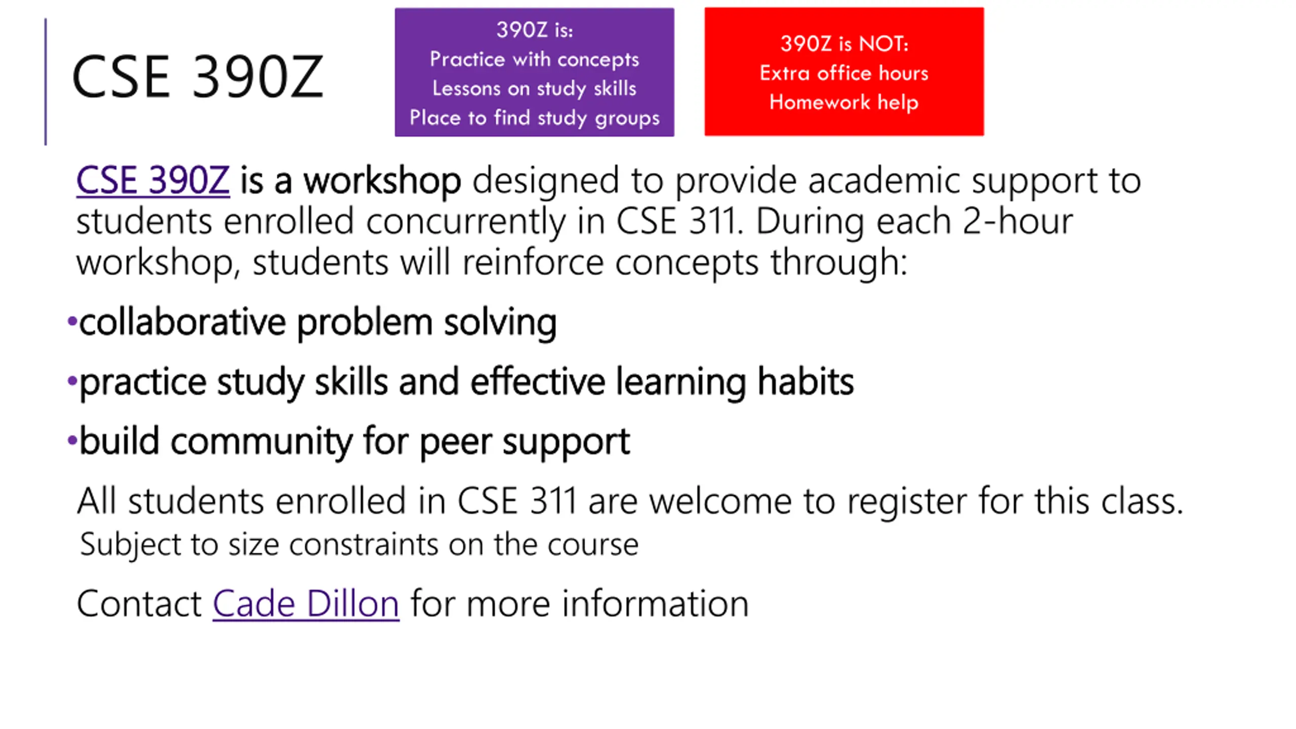 390Z is: 390Z is NOT: Extra office hours Homework help CSE 390Z Practice with concepts Lessons on study skills Place to find study groups CSE 390Z CSE 390Z is a students enrolled concurrently in CSE 311. During each 2-hour workshop, students will reinforce concepts through: collaborative problem solving collaborative problem solving practice study skills and effective learning habits practice study skills and effective learning habits build community for peer support build community for peer support All students enrolled in CSE 311 are welcome to register for this class. Subject to size constraints on the course Contact Cade Dillon for more information is a workshop workshop designed to provide academic support to