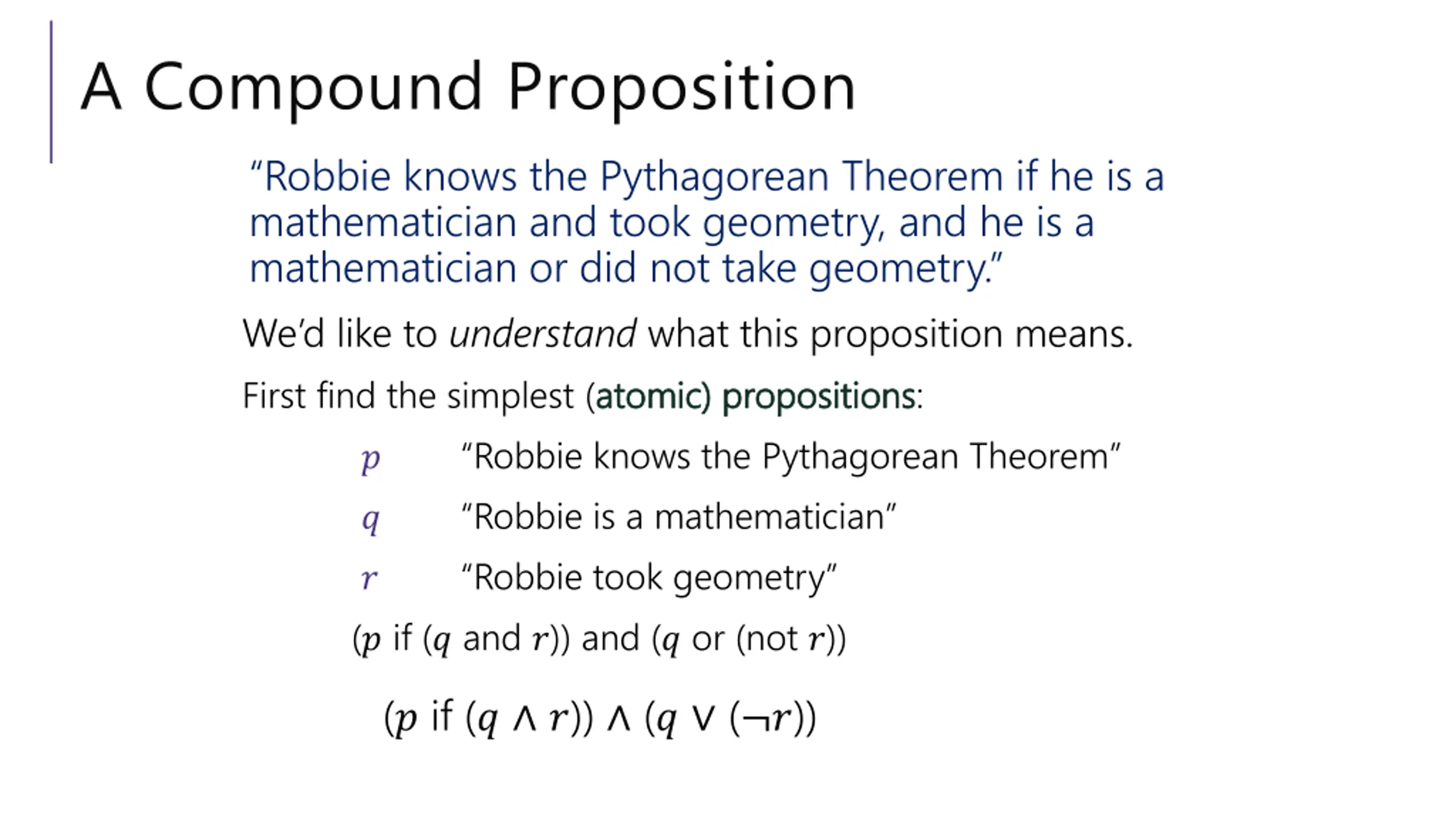 A Compound Proposition Robbie knows the Pythagorean Theorem if he is a mathematician and took geometry, and he is a mathematician or did not take geometry. We d like to understand what this proposition means. First find the simplest (atomic) propositions atomic) propositions: ? Robbie knows the Pythagorean Theorem ? Robbie is a mathematician ? Robbie took geometry (? if (? and ?)) and (? or (not ?)) (? if (? ?)) (? ( ?))
