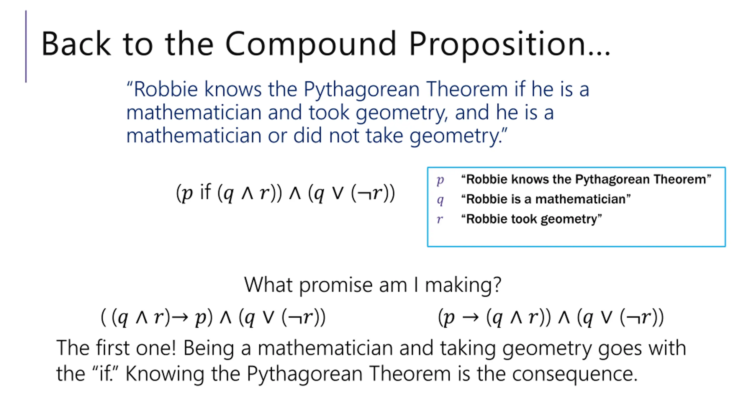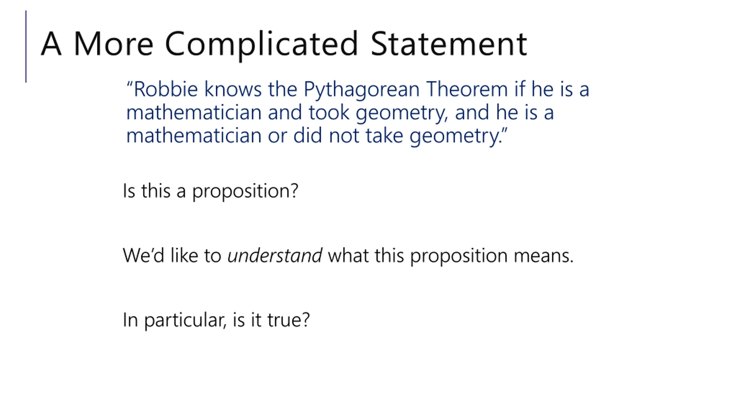 A More Complicated Statement Robbie knows the Pythagorean Theorem if he is a mathematician and took geometry, and he is a mathematician or did not take geometry. Is this a proposition? We d like to understand what this proposition means. In particular, is it true?