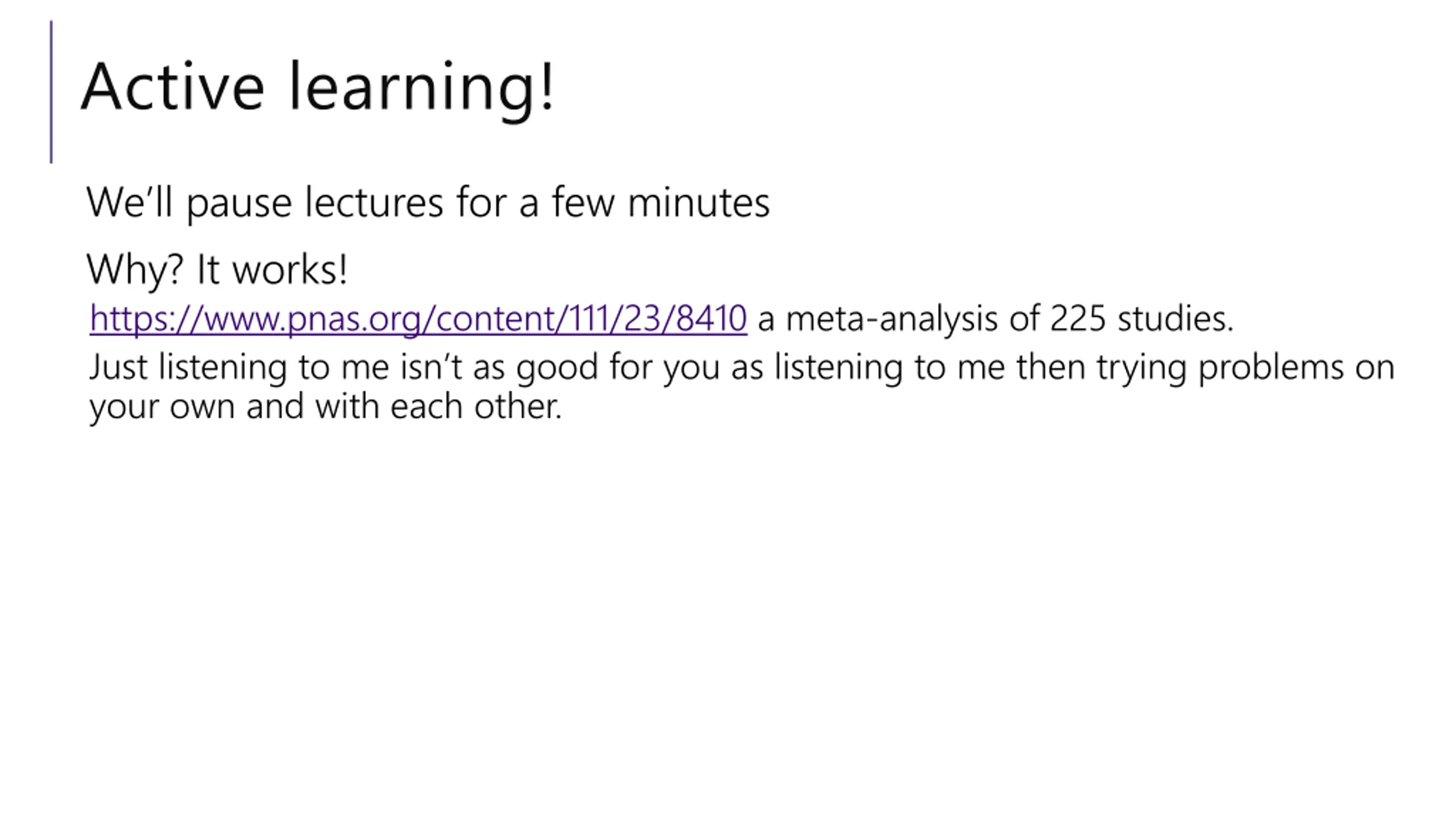 Active learning! We ll pause lectures for a few minutes Why? It works! https://www.pnas.org/content/111/23/8410 a meta-analysis of 225 studies. Just listening to me isn t as good for you as listening to me then trying problems on your own and with each other.