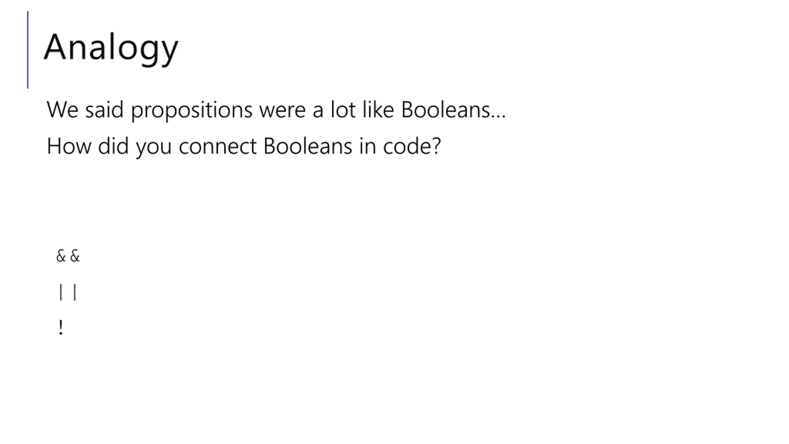 Analogy We said propositions were a lot like Booleans How did you connect Booleans in code? && || !
