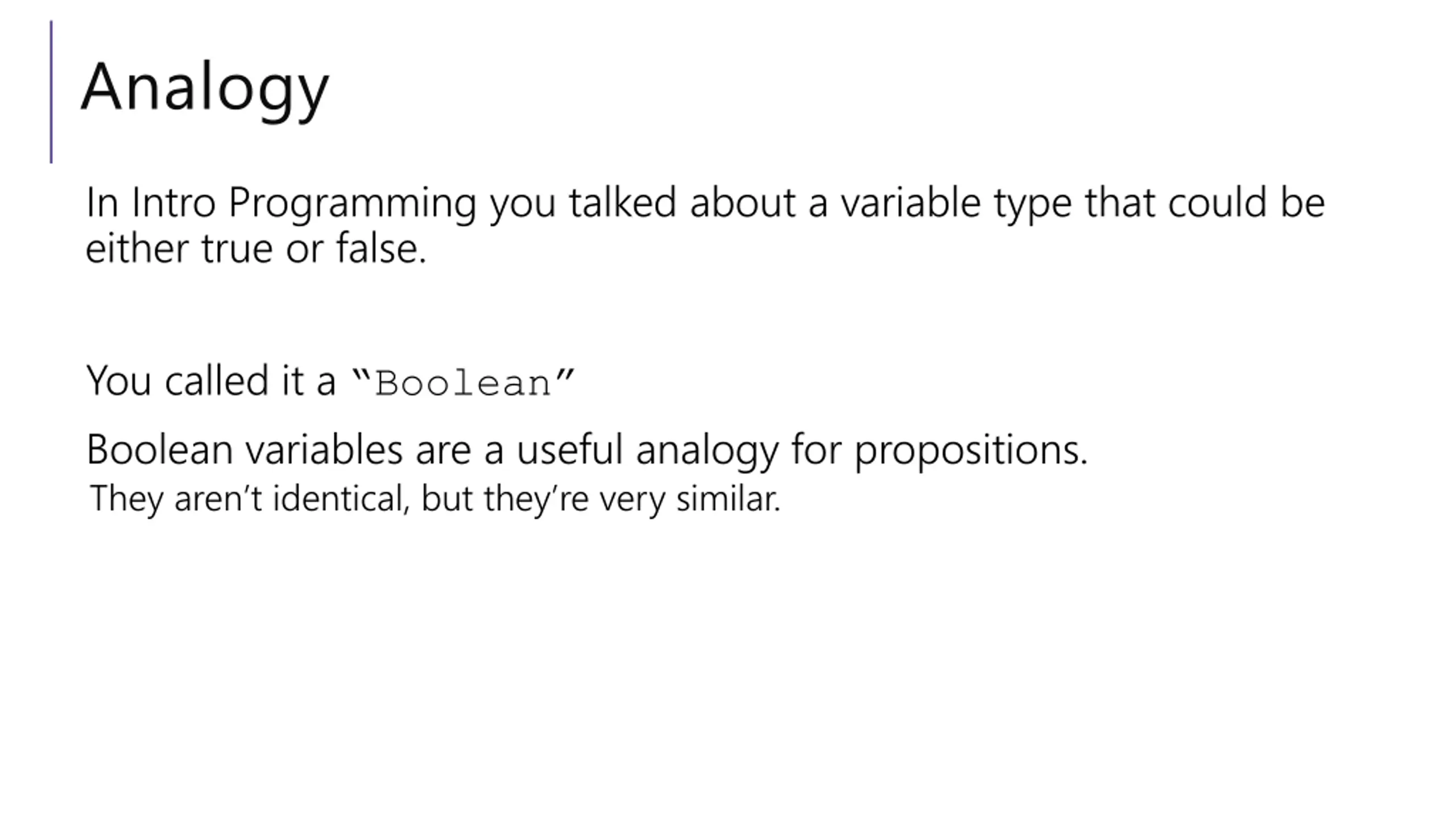 Analogy In Intro Programming you talked about a variable type that could be either true or false. You called it a Boolean Boolean variables are a useful analogy for propositions. They aren t identical, but they re very similar.