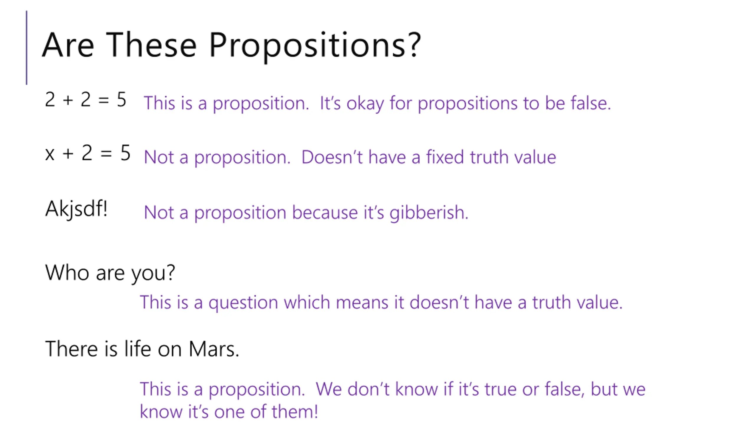Are These Propositions? 2 + 2 = 5 This is a proposition. It s okay for propositions to be false. x + 2 = 5 Not a proposition. Doesn t have a fixed truth value Akjsdf! Not a proposition because it s gibberish. Who are you? This is a question which means it doesn t have a truth value. There is life on Mars. This is a proposition. We don t know if it s true or false, but we know it s one of them!
