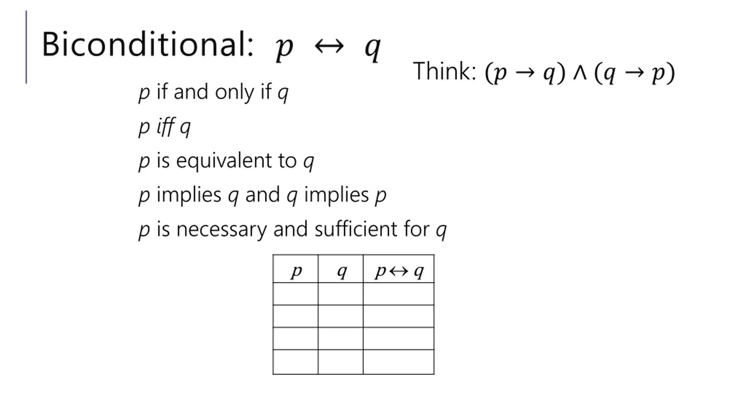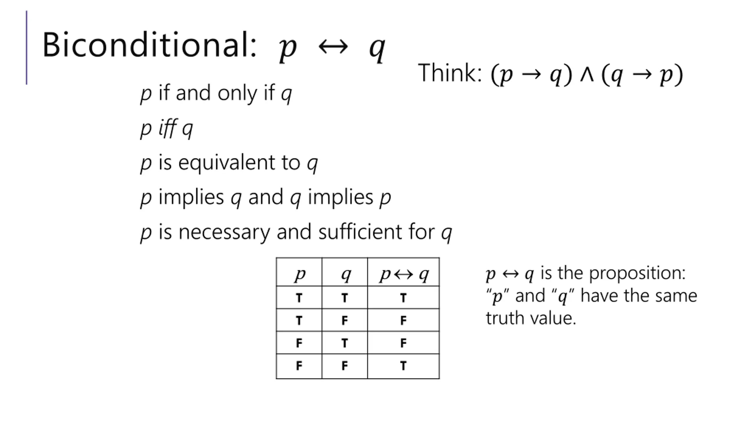 Biconditional: ? ? Think: (? ?) (? ?) p if and only if q p iff q p is equivalent to q p implies q and q implies p p is necessary and sufficient for q p q p q