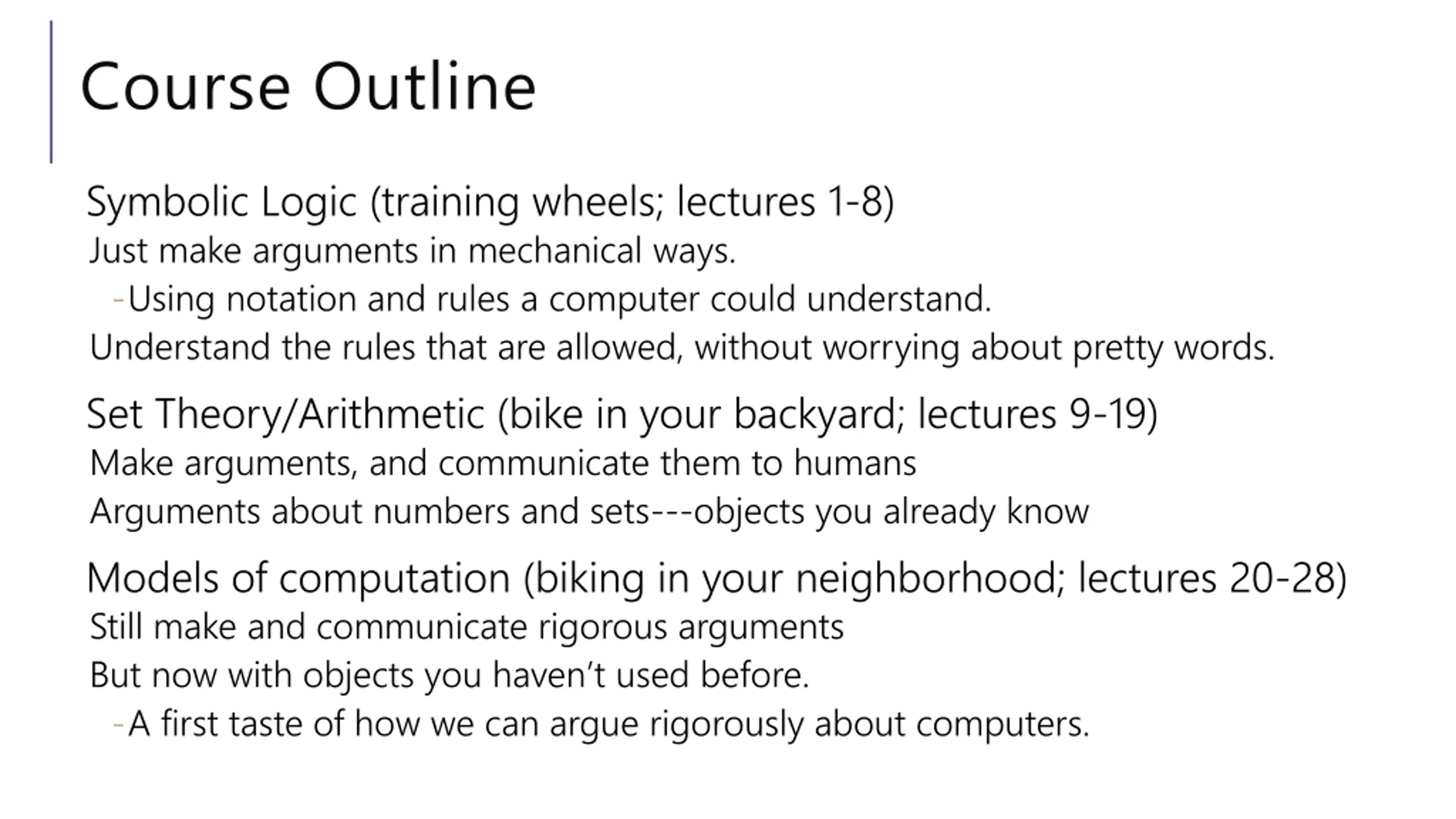 Course Outline Symbolic Logic (training wheels; lectures 1-8) Just make arguments in mechanical ways. -Using notation and rules a computer could understand. Understand the rules that are allowed, without worrying about pretty words. Set Theory/Arithmetic (bike in your backyard; lectures 9-19) Make arguments, and communicate them to humans Arguments about numbers and sets---objects you already know Models of computation (biking in your neighborhood; lectures 20-28) Still make and communicate rigorous arguments But now with objects you haven t used before. -A first taste of how we can argue rigorously about computers.