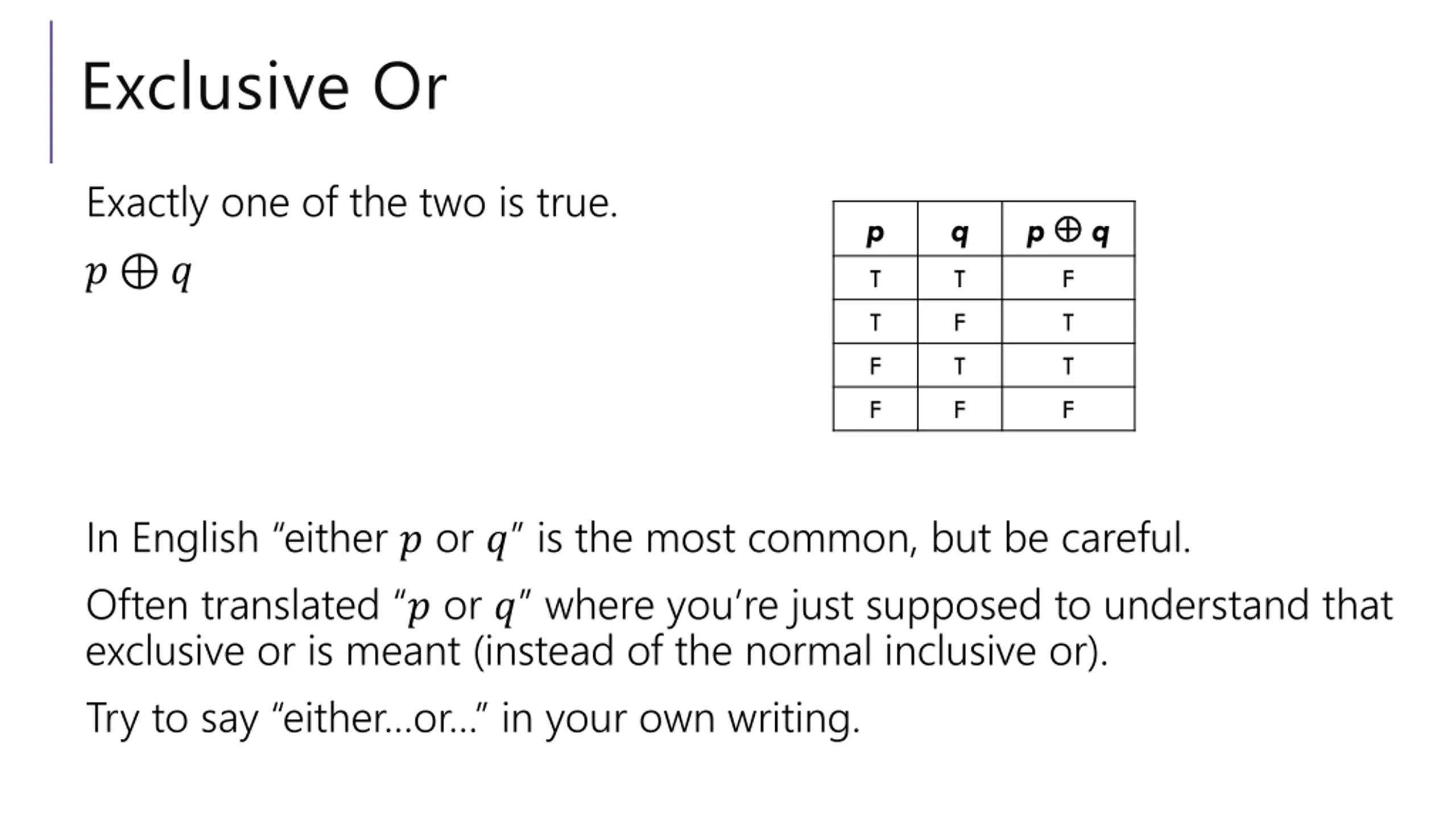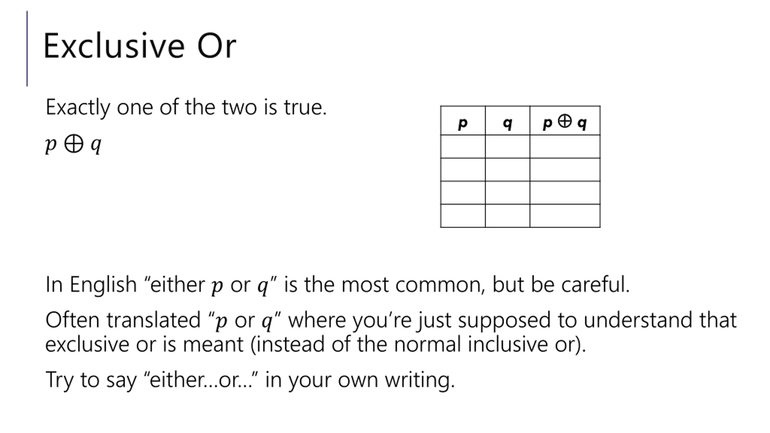 Exclusive Or Exactly one of the two is true. p q p q ? ? In English either ? or ? is the most common, but be careful. Often translated ? or ? where you re just supposed to understand that exclusive or is meant (instead of the normal inclusive or). Try to say either or in your own writing.