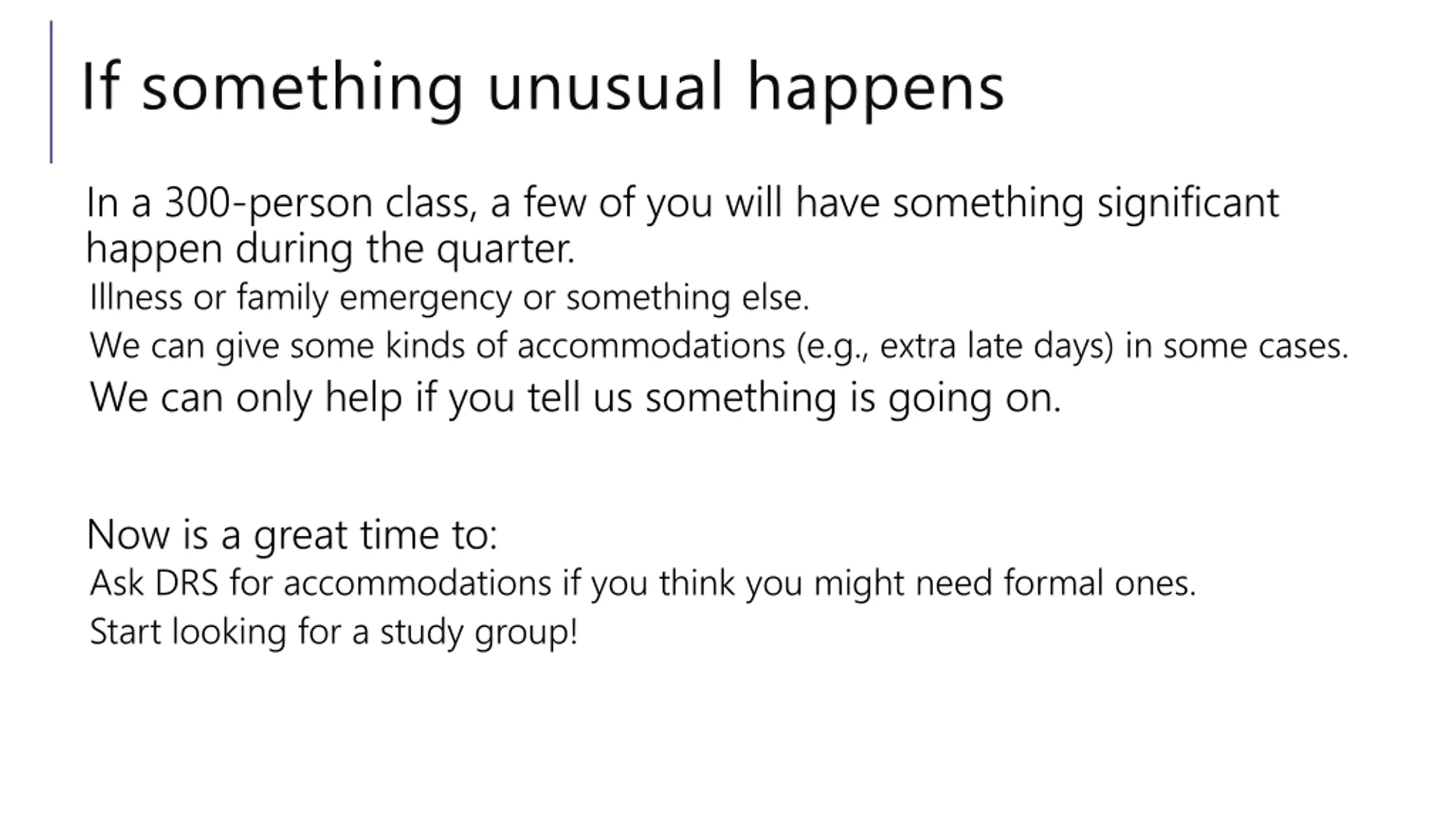 If something unusual happens In a 300-person class, a few of you will have something significant happen during the quarter. Illness or family emergency or something else. We can give some kinds of accommodations (e.g., extra late days) in some cases. We can only help if you tell us something is going on. Now is a great time to: Ask DRS for accommodations if you think you might need formal ones. Start looking for a study group!
