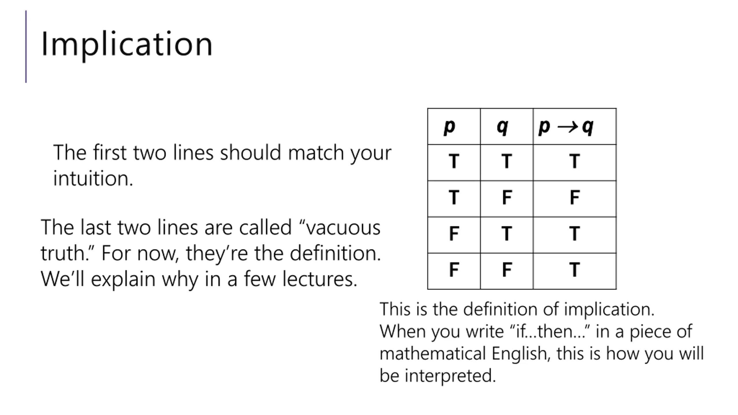 Implication p p q q p p q q The first two lines should match your intuition. T T T T F F The last two lines are called vacuous truth. For now, they re the definition. We ll explain why in a few lectures. F T T F F T This is the definition of implication. When you write if then in a piece of mathematical English, this is how you will be interpreted.