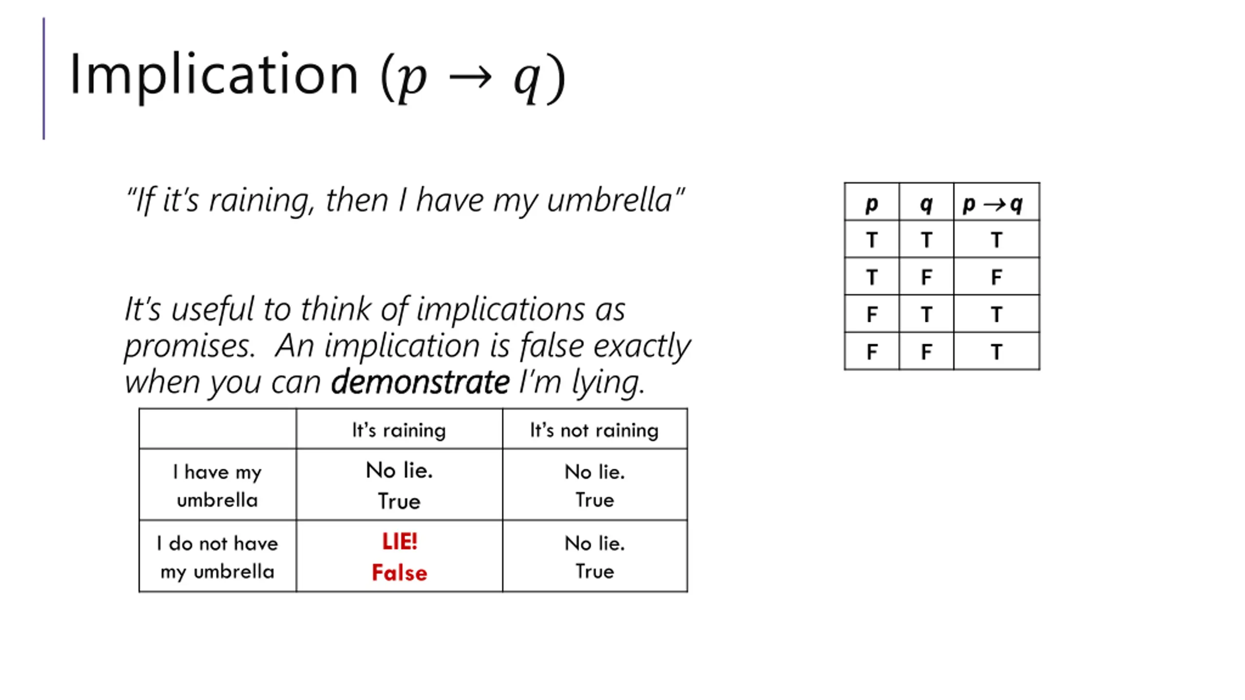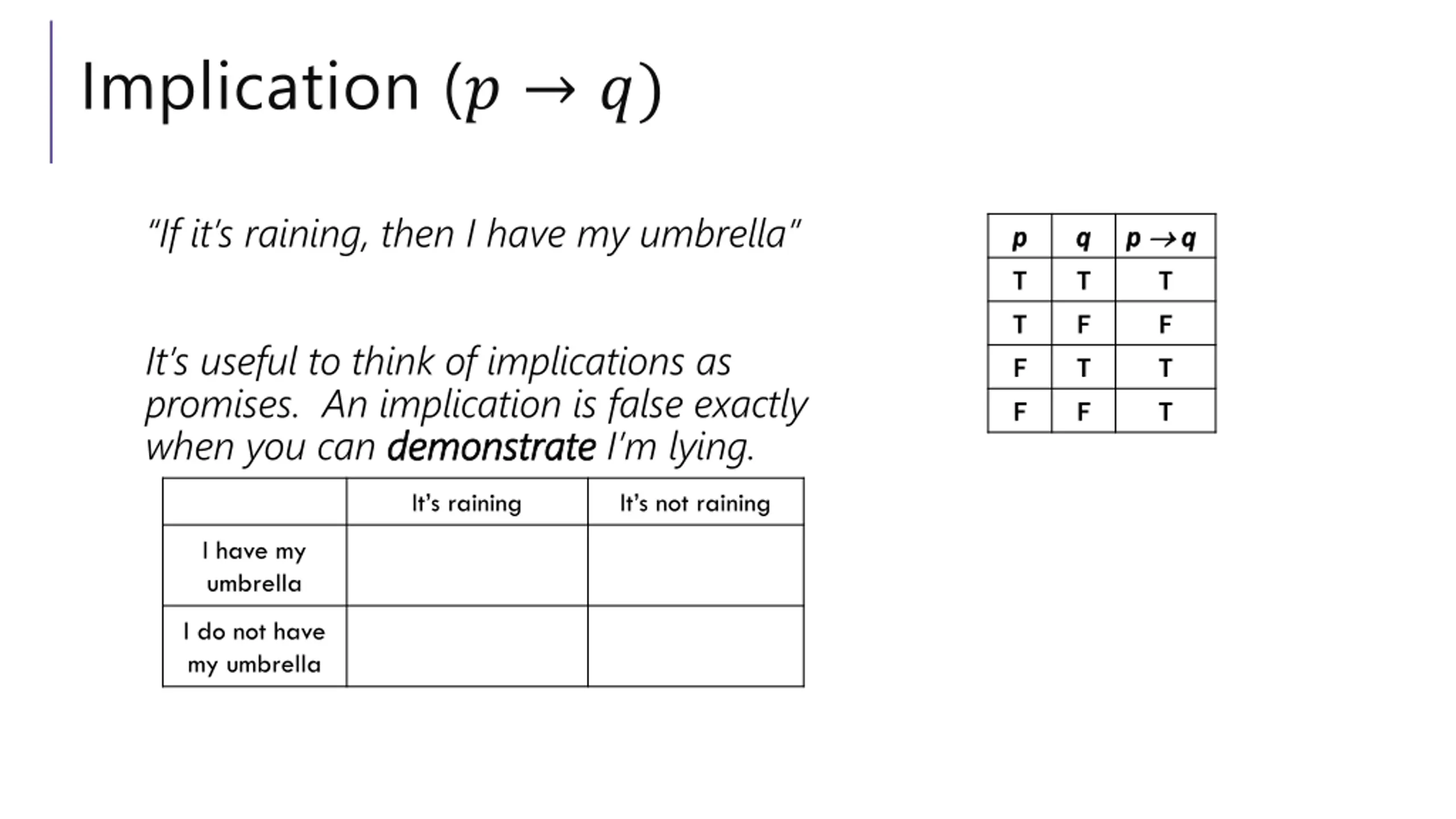 Implication (? ?) If it s raining, then I have my umbrella p p q q T F T T p p T T F F q q T F T F It s useful to think of implications as promises. An implication is false exactly when you can demonstrate demonstrate I m lying. It s raining It s not raining No lie. True LIE! False I have my umbrella No lie. True I do not have my umbrella No lie. True