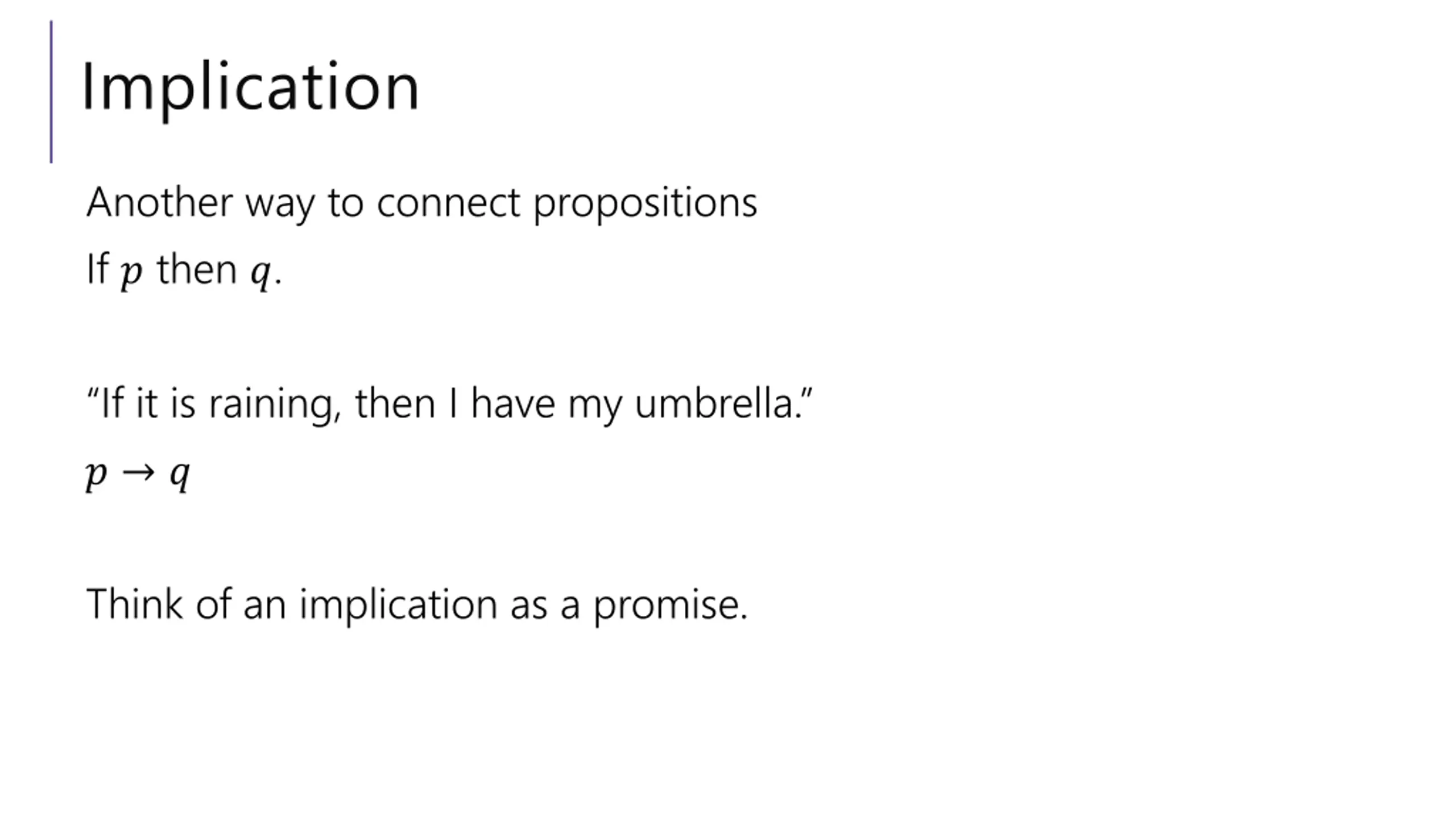 Implication Another way to connect propositions If ? then ?. If it is raining, then I have my umbrella. ? ? Think of an implication as a promise.