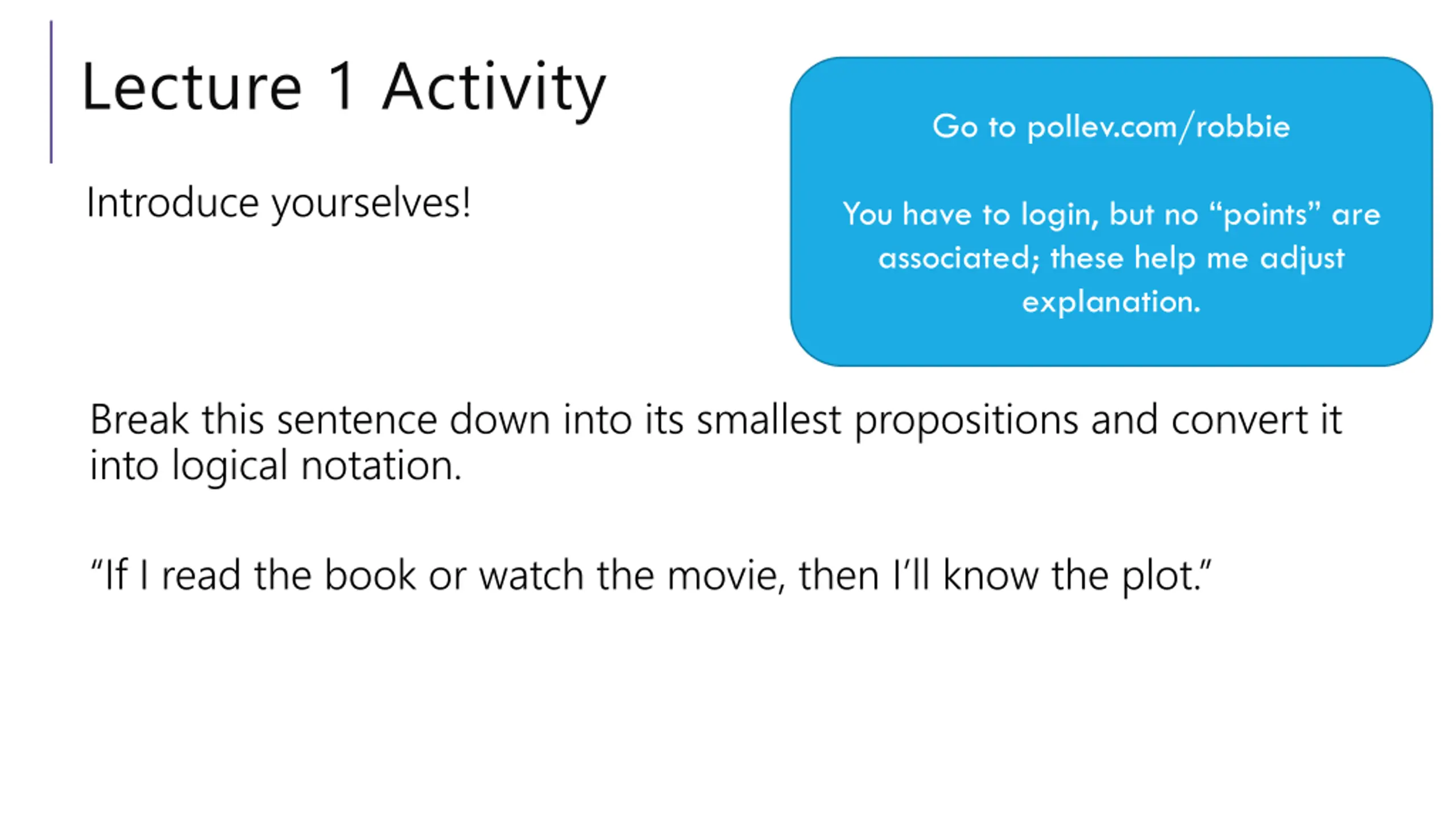 Lecture 1 Activity Go to pollev.com/robbie Introduce yourselves! You have to login, but no points are associated; these help me adjust explanation. Break this sentence down into its smallest propositions and convert it into logical notation. If I read the book or watch the movie, then I ll know the plot.