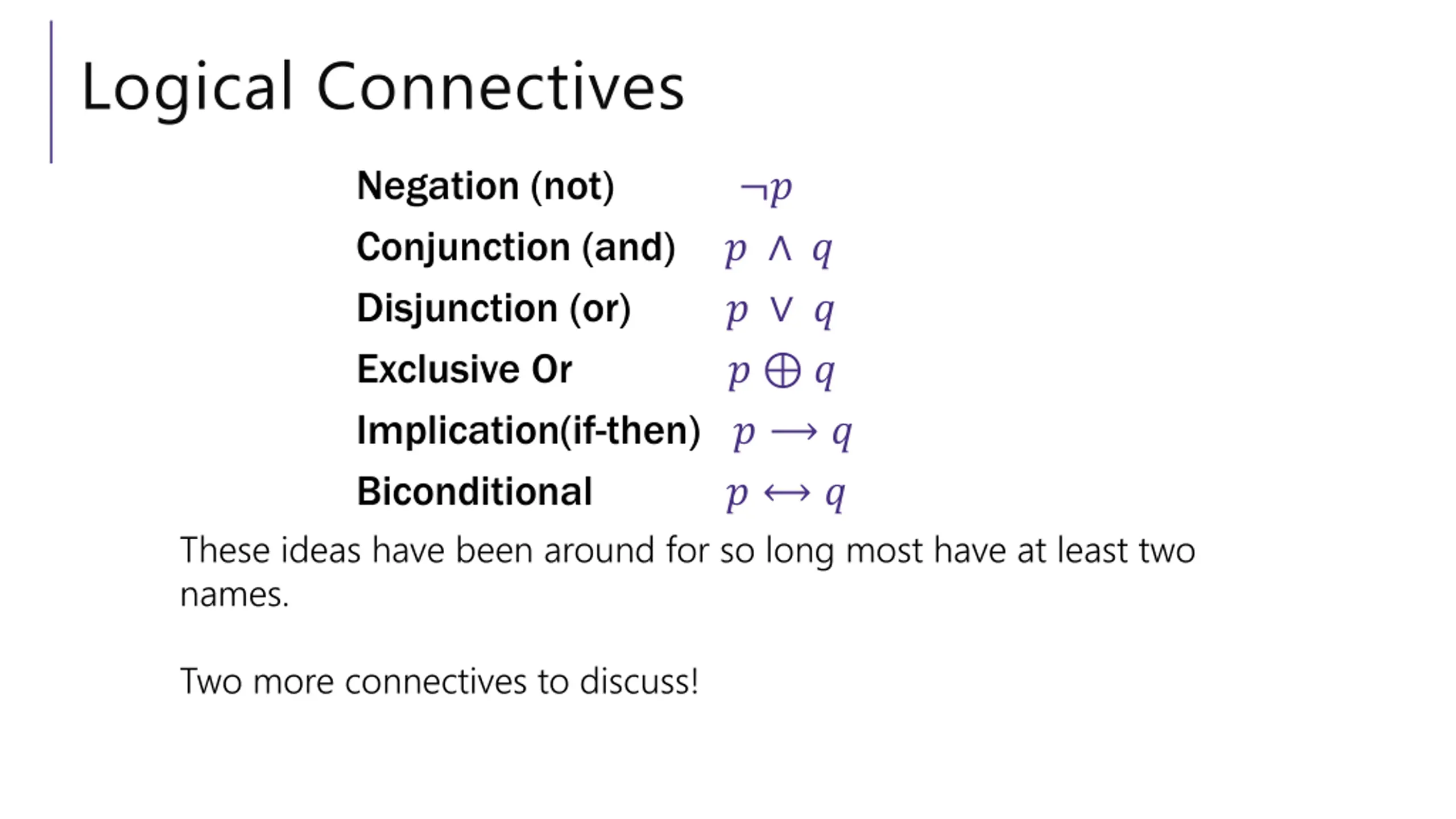Logical Connectives Negation (not) Conjunction (and) Disjunction (or) Exclusive Or Implication(if-then) ? ? Biconditional These ideas have been around for so long most have at least two names. ? ? ? ? ? ? ? ? ? Two more connectives to discuss!
