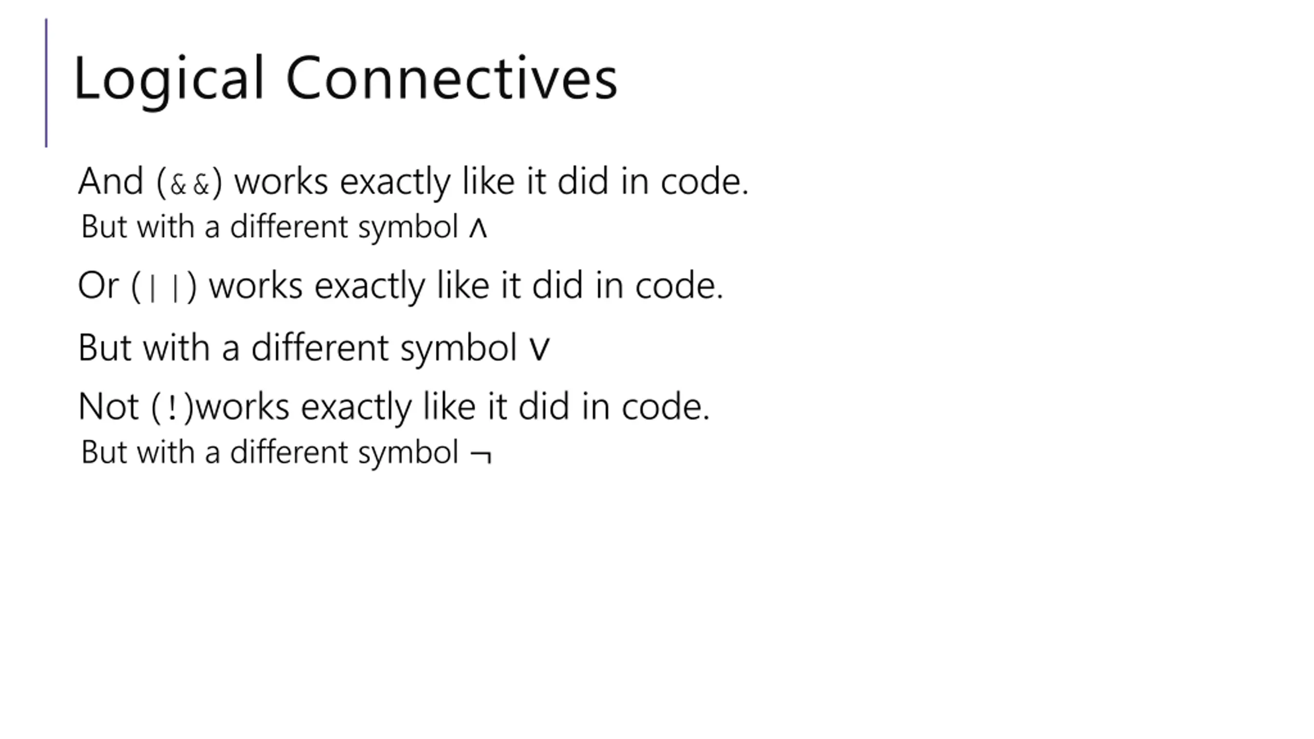 Logical Connectives And (&&) works exactly like it did in code. But with a different symbol Or (||) works exactly like it did in code. But with a different symbol Not (!)works exactly like it did in code. But with a different symbol