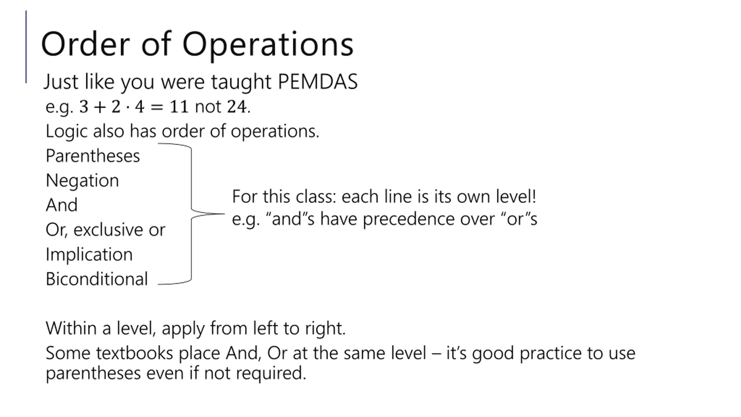 Order of Operations Just like you were taught PEMDAS e.g. 3 + 2 4 = 11 not 24. Logic also has order of operations. Parentheses Negation And Or, exclusive or Implication Biconditional For this class: each line is its own level! e.g. and shave precedence over or s Within a level, apply from left to right. Some textbooks place And, Or at the same level it s good practice to use parentheses even if not required.