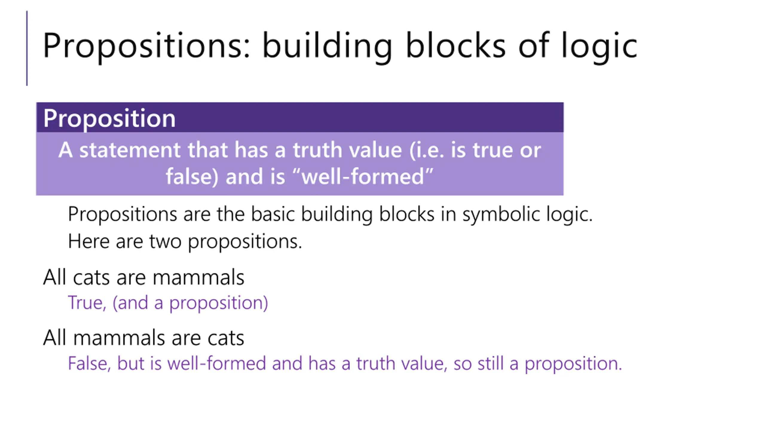 Propositions: building blocks of logic Proposition A statement that has a truth value (i.e. is true or false) and is well-formed Propositions are the basic building blocks in symbolic logic. Here are two propositions. All cats are mammals True, (and a proposition) All mammals are cats False, but is well-formed and has a truth value, so still a proposition.