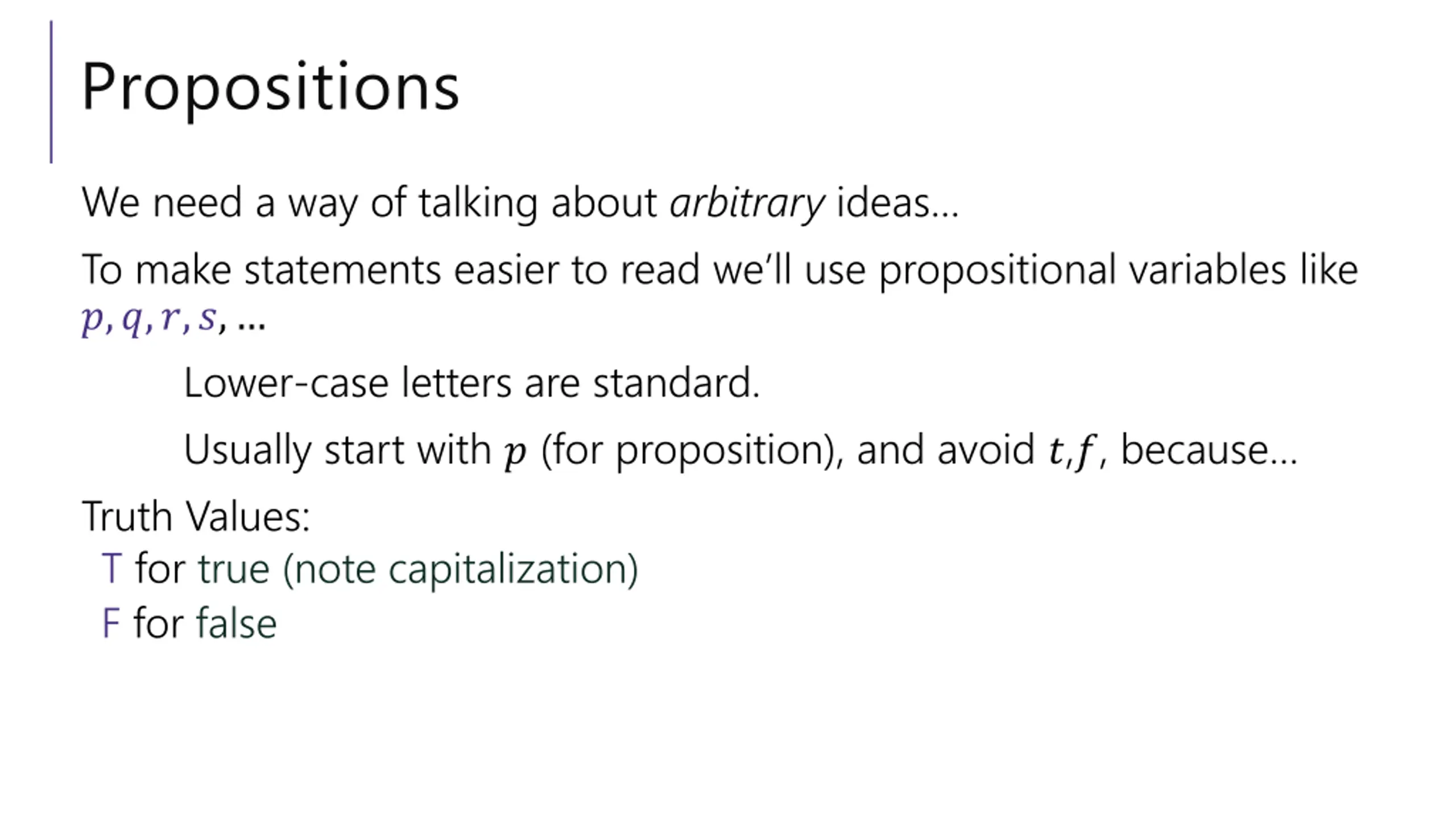 Propositions We need a way of talking about arbitraryideas To make statements easier to read we ll use propositional variables like ?,?,?,?, Lower-case letters are standard. Usually start with ? (for proposition), and avoid ?,?, because Truth Values: T for true (note capitalization) F for false