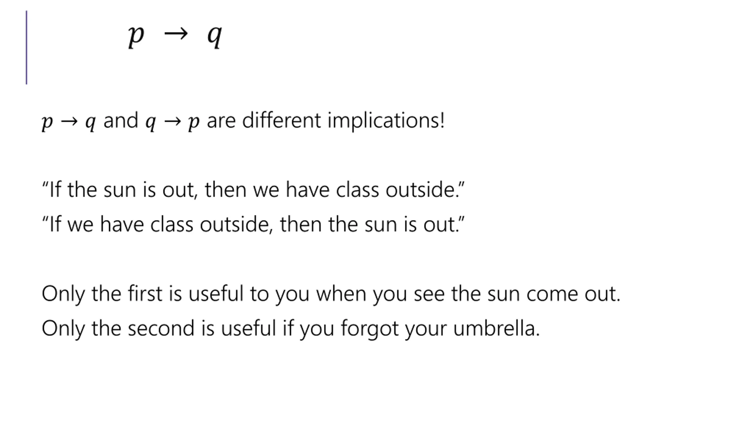 ? ? ? ? and ? ? are different implications! If the sun is out, then we have class outside. If we have class outside, then the sun is out. Only the first is useful to you when you see the sun come out. Only the second is useful if you forgot your umbrella.