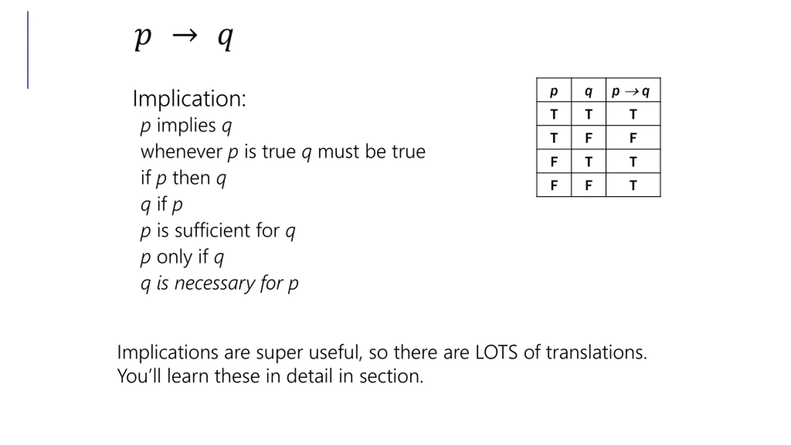 ? ? p q T F T T Implication: p implies q whenever p is true q must be true if p then q q if p p is sufficient for q p only if q q is necessary for p p T T F F q T F T F Implications are super useful, so there are LOTS of translations. You ll learn these in detail in section.