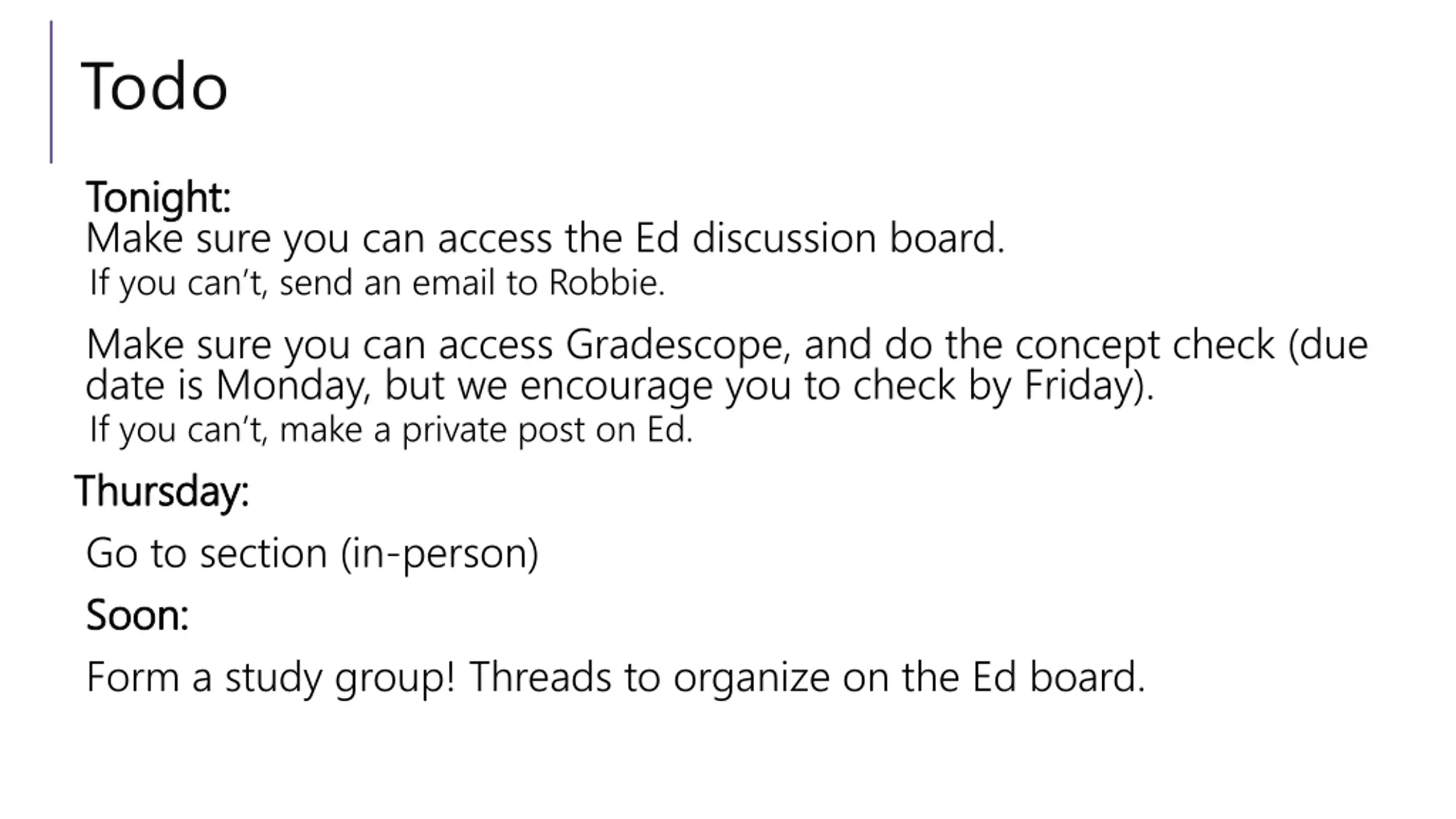 Todo Tonight: Tonight: Make sure you can access the Ed discussion board. If you can t, send an email to Robbie. Make sure you can access Gradescope, and do the concept check (due date is Monday, but we encourage you to check by Friday). If you can t, make a private post on Ed. Thursday: Thursday: Go to section (in-person) Soon: Soon: Form a study group! Threads to organize on the Ed board.