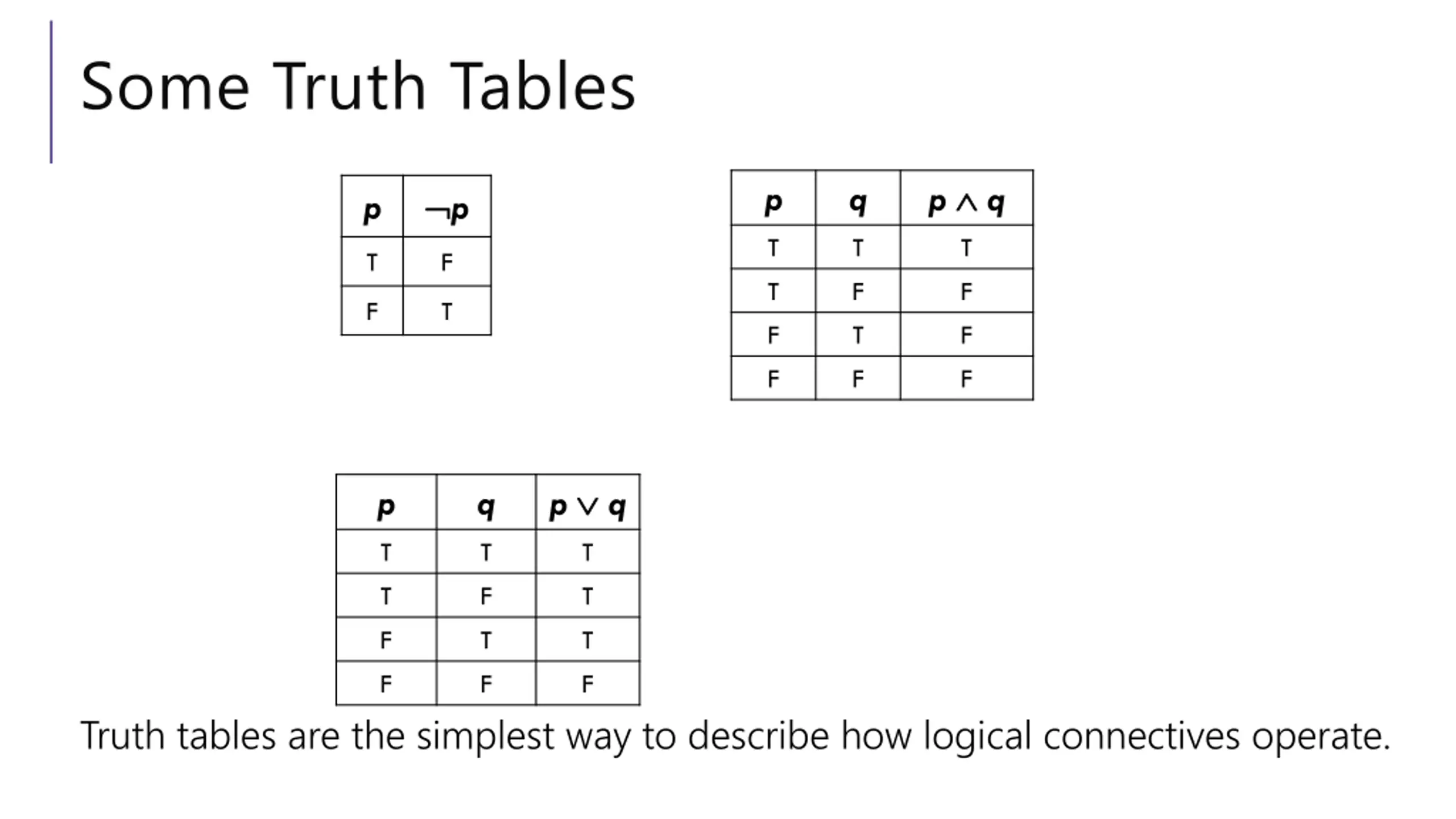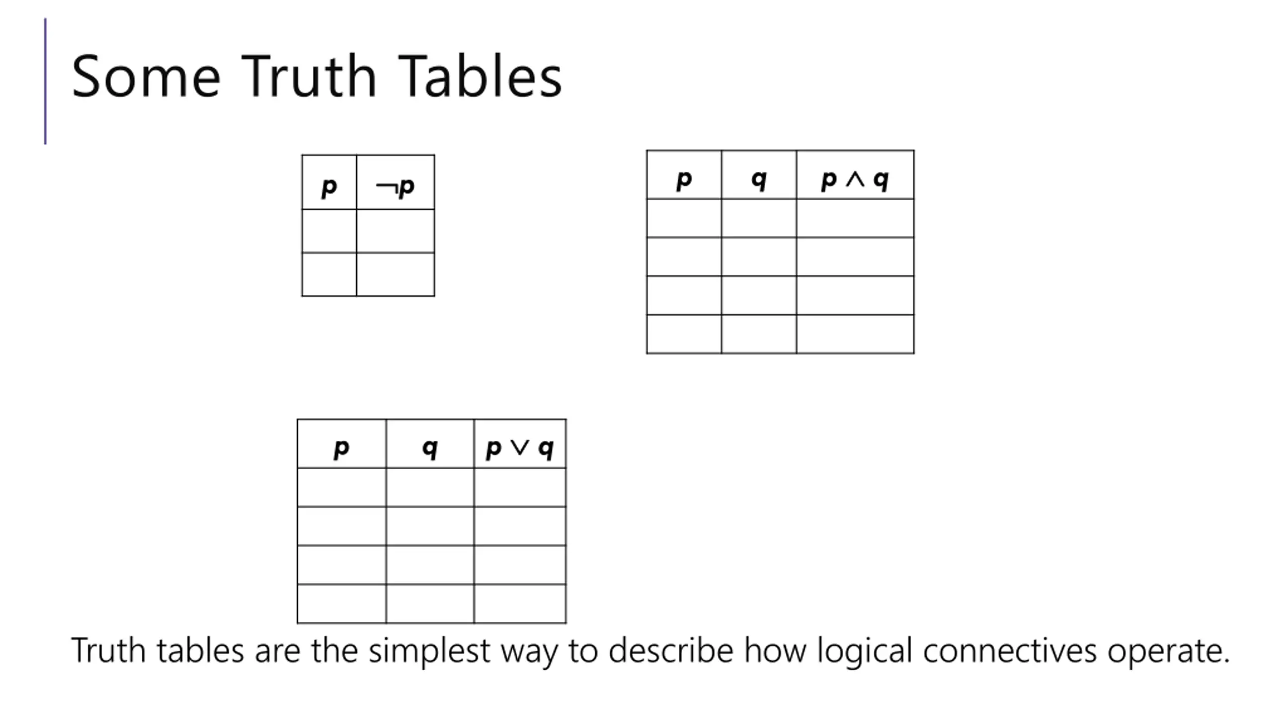 Some Truth Tables p q p q p p p q p q Truth tables are the simplest way to describe how logical connectives operate.
