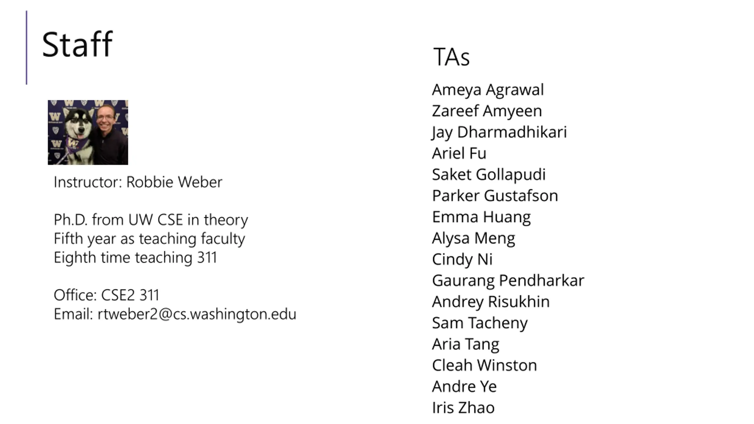 Staff TAs Ameya Agrawal Zareef Amyeen Jay Dharmadhikari Ariel Fu Saket Gollapudi Parker Gustafson Emma Huang Alysa Meng Cindy Ni Gaurang Pendharkar Andrey Risukhin Sam Tacheny Aria Tang Cleah Winston Andre Ye Iris Zhao Instructor: Robbie Weber Ph.D. from UW CSE in theory Fifth year as teaching faculty Eighth time teaching 311 Office: CSE2 311 Email: rtweber2@cs.washington.edu