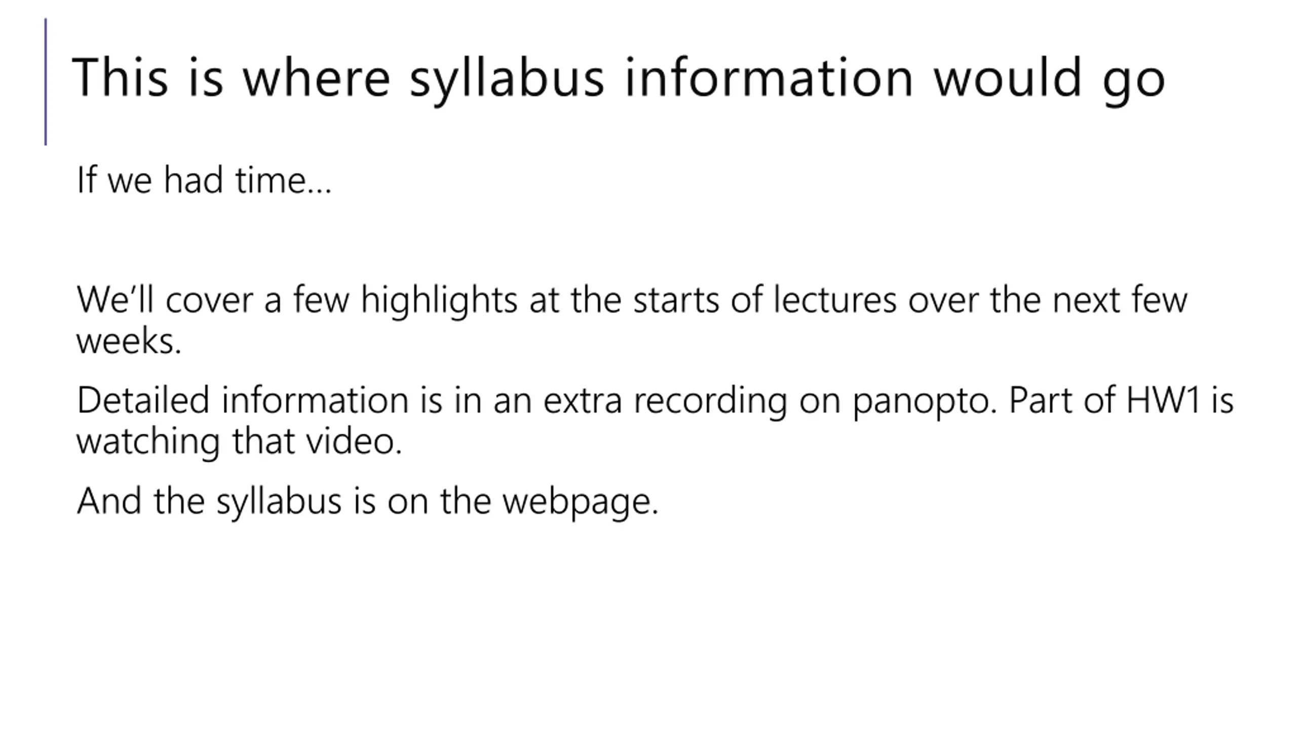 This is where syllabus information would go If we had time We ll cover a few highlights at the starts of lectures over the next few weeks. Detailed information is in an extra recording on panopto. Part of HW1 is watching that video. And the syllabus is on the webpage.