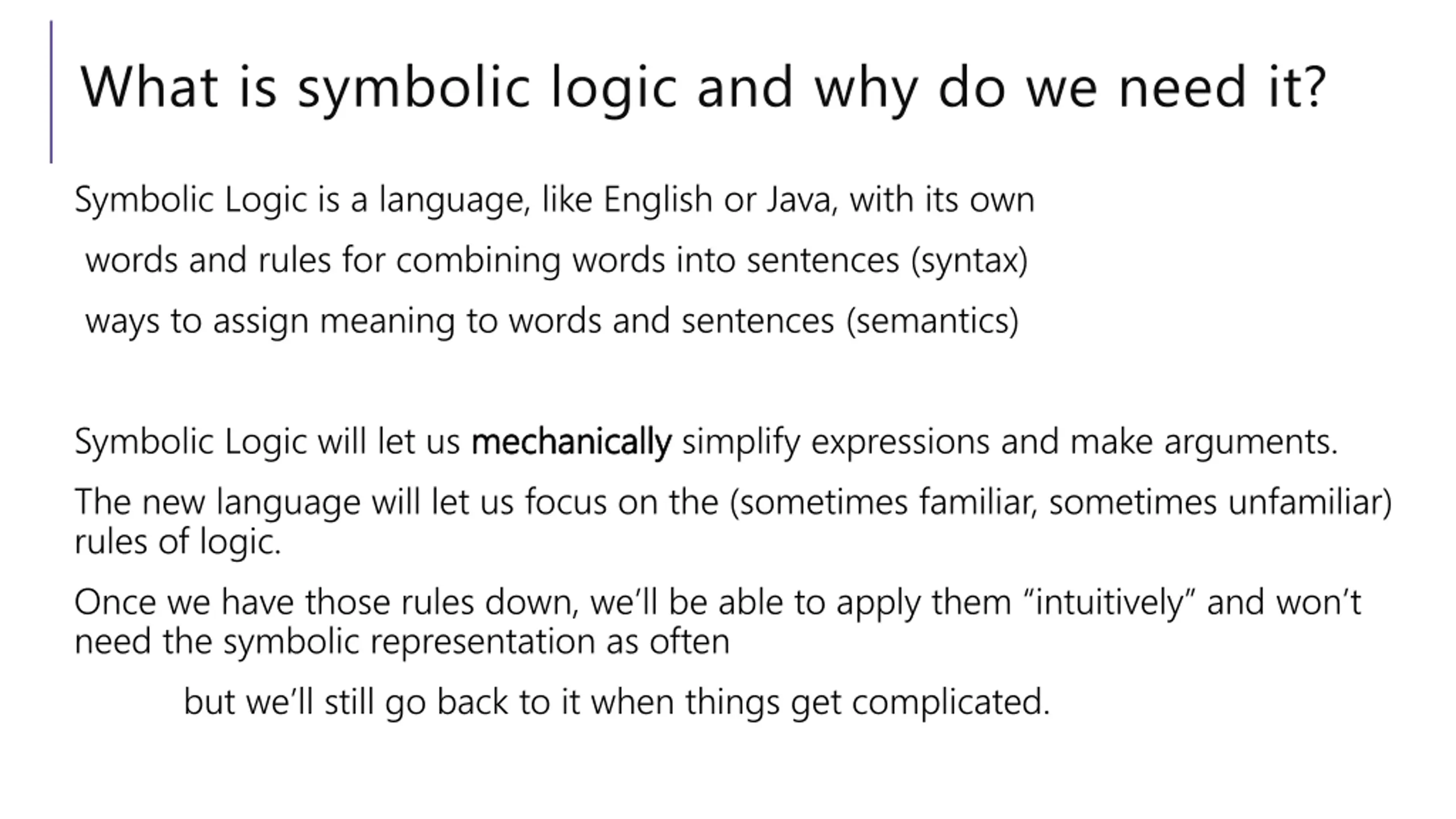 What is symbolic logic and why do we need it? Symbolic Logic is a language, like English or Java, with its own words and rules for combining words into sentences (syntax) ways to assign meaning to words and sentences (semantics) Symbolic Logic will let us mechanically The new language will let us focus on the (sometimes familiar, sometimes unfamiliar) rules of logic. Once we have those rules down, we ll be able to apply them intuitively and won t need the symbolic representation as often but we ll still go back to it when things get complicated. mechanically simplify expressions and make arguments.