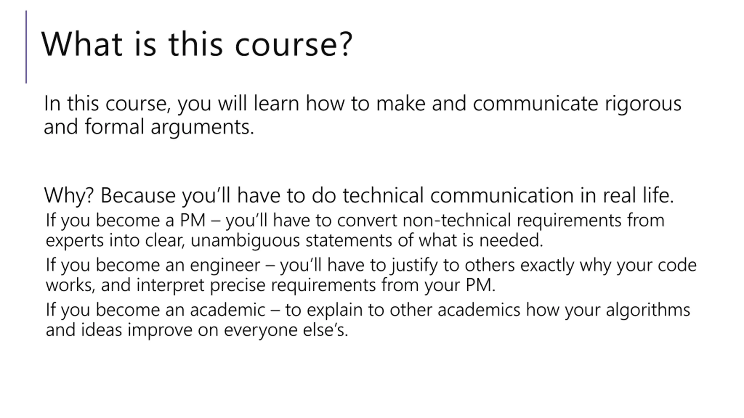 What is this course? In this course, you will learn how to make and communicate rigorous and formal arguments. Why? Because you ll have to do technical communication in real life. If you become a PM you ll have to convert non-technical requirements from experts into clear, unambiguous statements of what is needed. If you become an engineer you ll have to justify to others exactly why your code works, and interpret precise requirements from your PM. If you become an academic to explain to other academics how your algorithms and ideas improve on everyone else s.