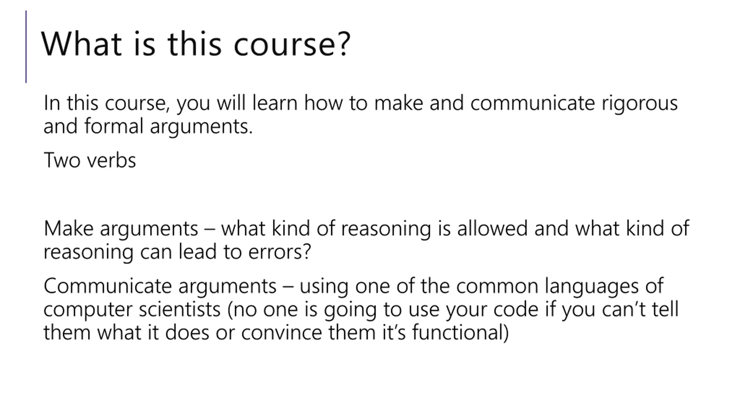 What is this course? In this course, you will learn how to make and communicate rigorous and formal arguments. Two verbs Make arguments what kind of reasoning is allowed and what kind of reasoning can lead to errors? Communicate arguments using one of the common languages of computer scientists (no one is going to use your code if you can t tell them what it does or convince them it s functional)