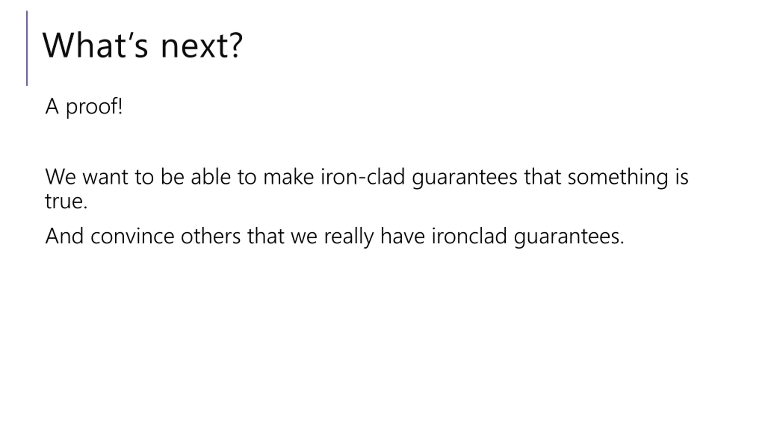 Whats next? A proof! We want to be able to make iron-clad guarantees that something is true. And convince others that we really have ironclad guarantees.