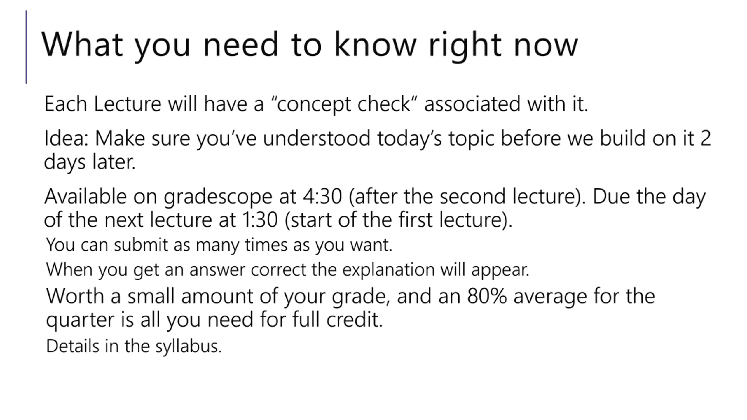 What you need to know right now Each Lecture will have a concept check associated with it. Idea: Make sure you ve understood today s topic before we build on it 2 days later. Available on gradescope at 4:30 (after the second lecture). Due the day of the next lecture at 1:30 (start of the first lecture). You can submit as many times as you want. When you get an answer correct the explanation will appear. Worth a small amount of your grade, and an 80% average for the quarter is all you need for full credit. Details in the syllabus.