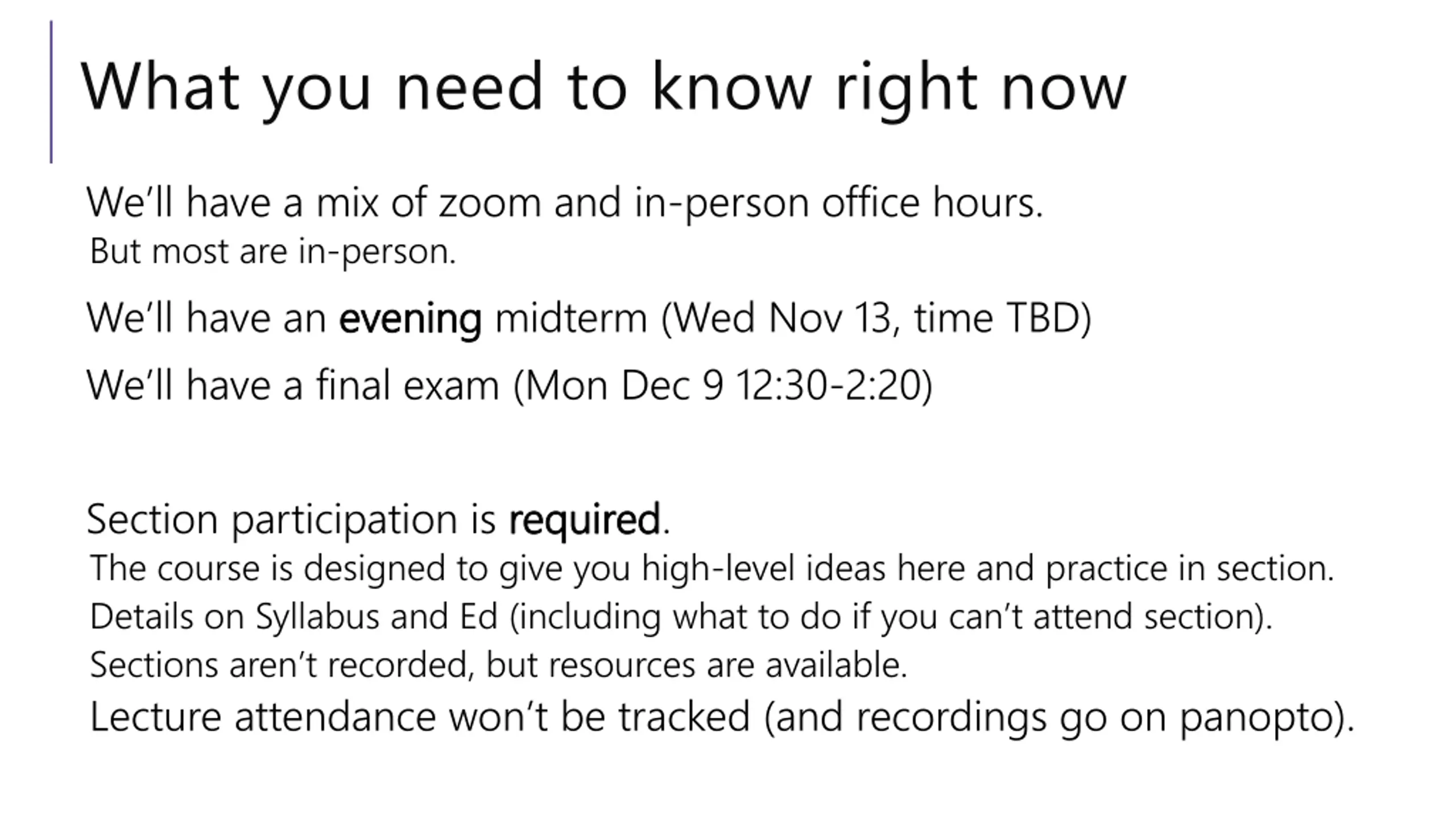 What you need to know right now We ll have a mix of zoom and in-person office hours. But most are in-person. We ll have an evening evening midterm (Wed Nov 13, time TBD) We ll have a final exam (Mon Dec 9 12:30-2:20) Section participation is required The course is designed to give you high-level ideas here and practice in section. Details on Syllabus and Ed (including what to do if you can t attend section). Sections aren t recorded, but resources are available. Lecture attendance won t be tracked (and recordings go on panopto). required.