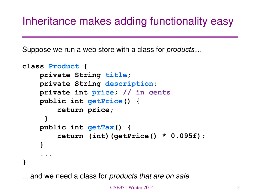Inheritance makes small extensions small Much better: class SaleProduct extends Product { private float factor; public int getPrice() { return (int)(super.getPrice()*factor); } } CSE331 Winter 2014 7