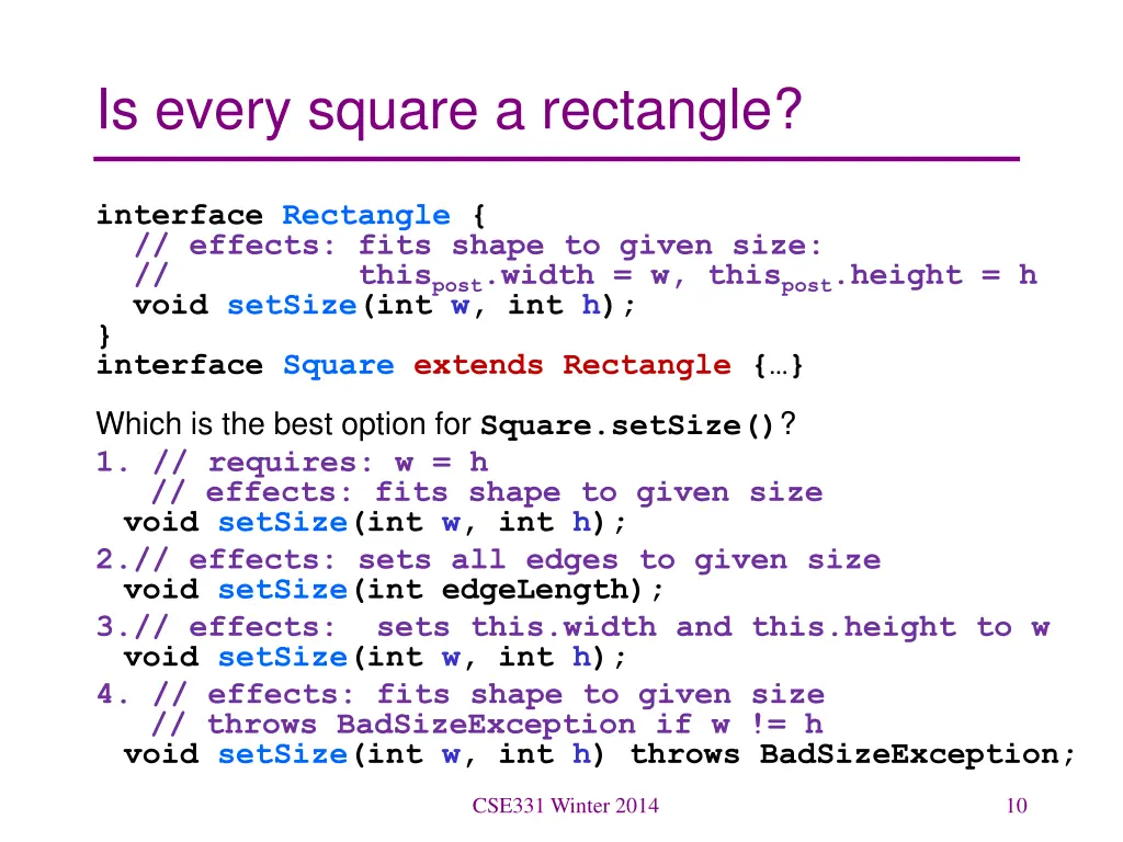 Is every square a rectangle? interface Rectangle { // effects: fits shape to given size: // thispost.width = w, thispost.height = h void setSize(int w, int h); } interface Square extends Rectangle { } Which is the best option for Square.setSize()? 1. // requires: w = h // effects: fits shape to given size void setSize(int w, int h); 2.// effects: sets all edges to given size void setSize(int edgeLength); 3.// effects: sets this.width and this.height to w void setSize(int w, int h); 4. // effects: fits shape to given size // throws BadSizeException if w != h void setSize(int w, int h) throws BadSizeException; CSE331 Winter 2014 10