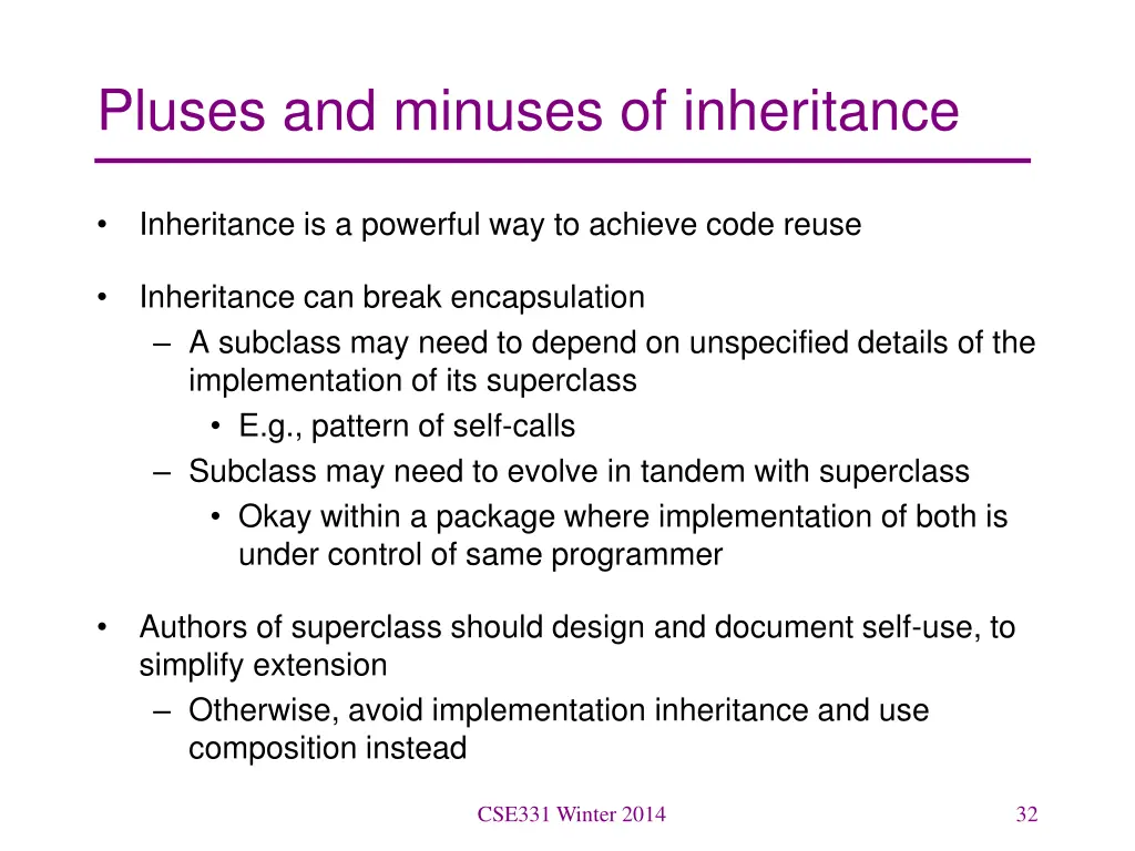 Pluses and minuses of inheritance Inheritance is a powerful way to achieve code reuse Inheritance can break encapsulation A subclass may need to depend on unspecified details of the implementation of its superclass E.g., pattern of self-calls Subclass may need to evolve in tandem with superclass Okay within a package where implementation of both is under control of same programmer Authors of superclass should design and document self-use, to simplify extension Otherwise, avoid implementation inheritance and use composition instead CSE331 Winter 2014 32