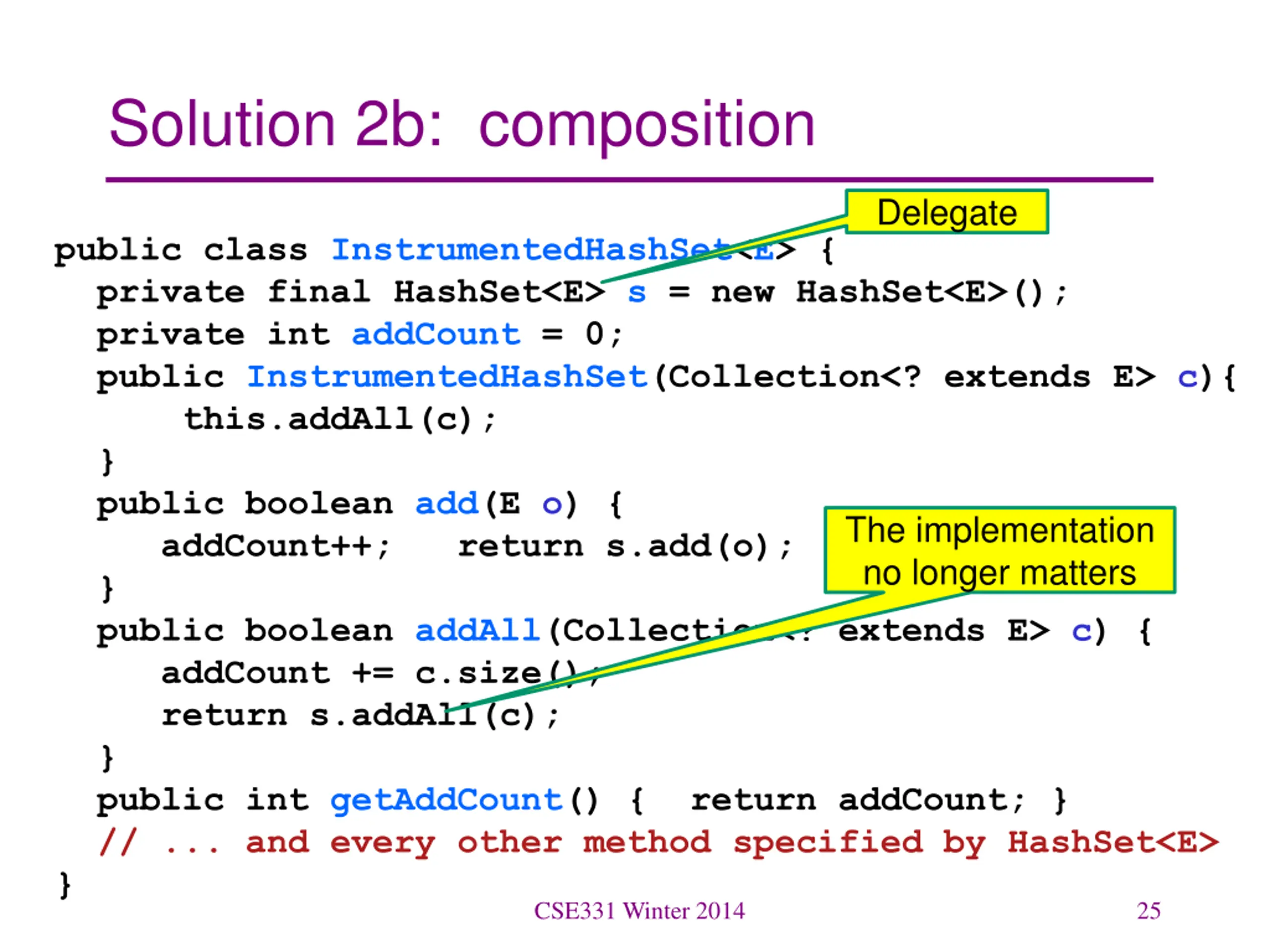 Solution 2b: composition Delegate public class InstrumentedHashSet<E> { private final HashSet<E> s = new HashSet<E>(); private int addCount = 0; public InstrumentedHashSet(Collection<? extends E> c){ this.addAll(c); } public boolean add(E o) { addCount++; return s.add(o); } public boolean addAll(Collection<? extends E> c) { addCount += c.size(); return s.addAll(c); } public int getAddCount() { return addCount; } // ... and every other method specified by HashSet<E> } CSE331 Winter 2014 The implementation no longer matters 25