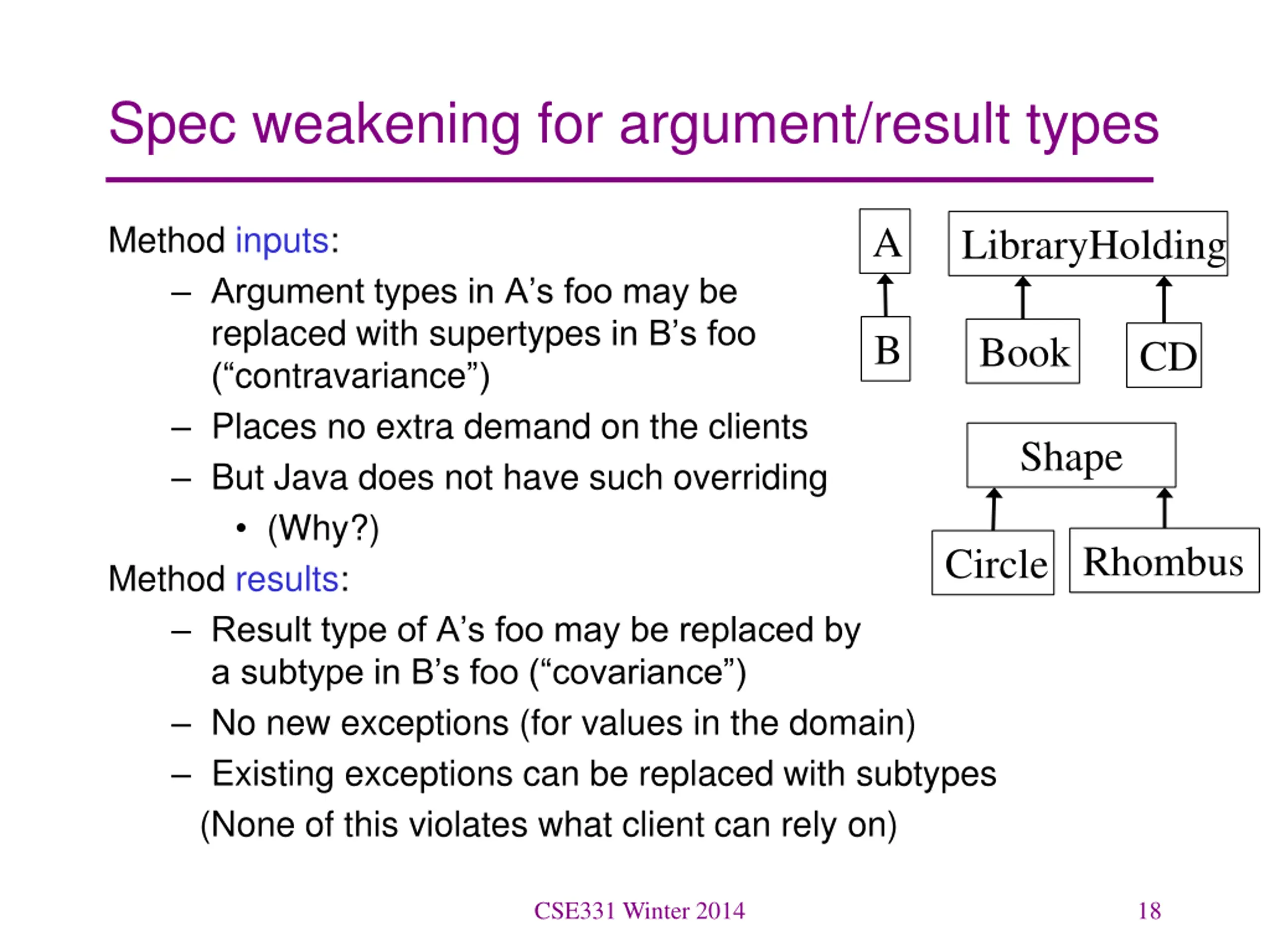 Substitution principle for methods Constraints on methods For each supertype method, subtype must have such a method Could be inherited or overridden Each overriding method must strengthen (or match) the spec: Ask nothing extra of client ( weaker precondition ) Requires clause is at most as strict as in supertype s method Guarantee at least as much ( stronger postcondition ) Effects clause is at least as strict as in the supertype method No new entries in modifies clause Promise more (or the same) in returns clause Throws clause must indicate fewer (or same) possible exception types CSE331 Winter 2014 17