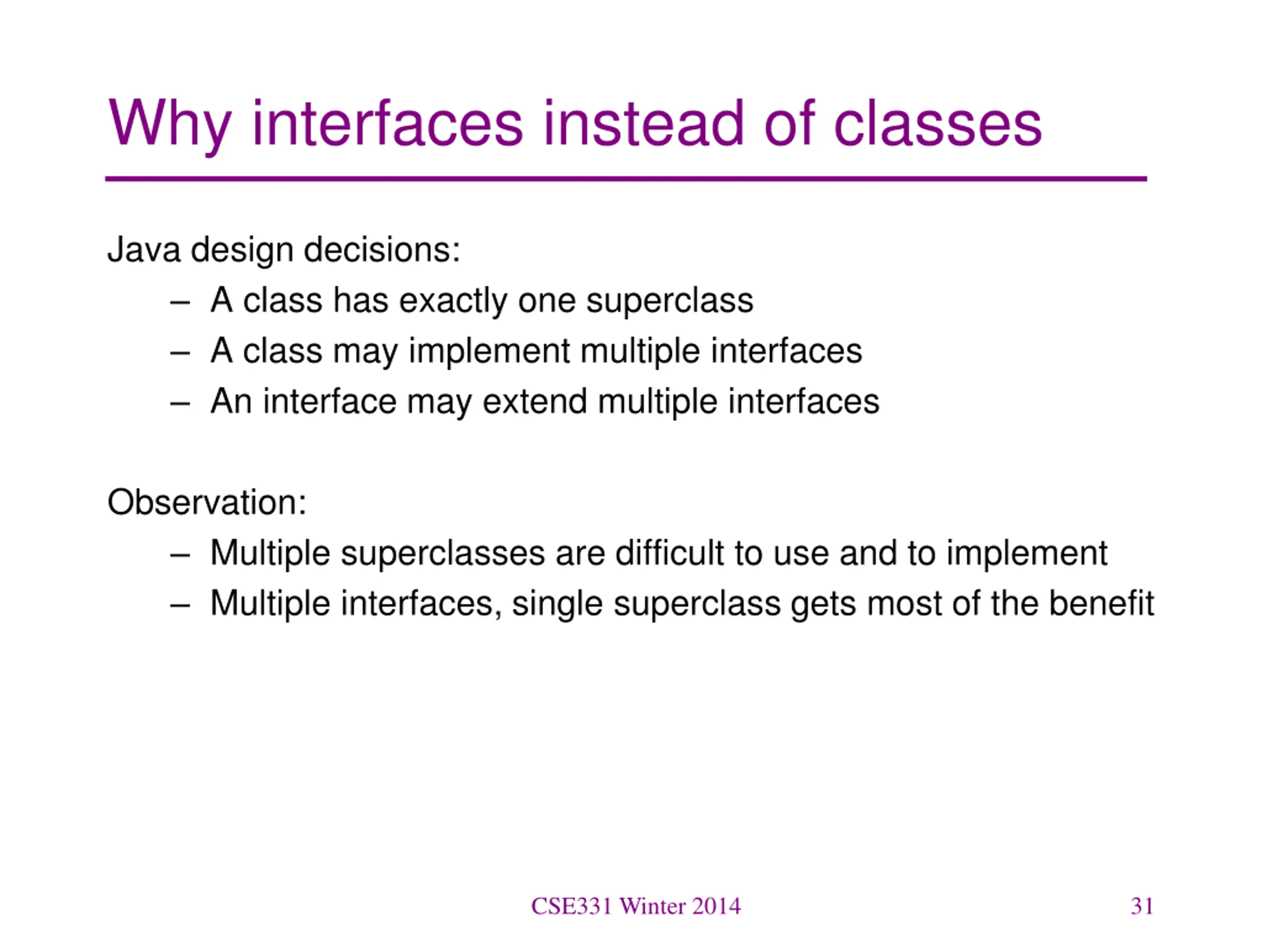 Why interfaces instead of classes Java design decisions: A class has exactly one superclass A class may implement multiple interfaces An interface may extend multiple interfaces Observation: Multiple superclasses are difficult to use and to implement Multiple interfaces, single superclass gets most of the benefit CSE331 Winter 2014 31