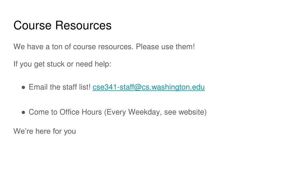 Course Resources We have a ton of course resources. Please use them! If you get stuck or need help: Email the staff list! cse341-staff@cs.washington.edu Come to Office Hours (Every Weekday, see website) We re here for you